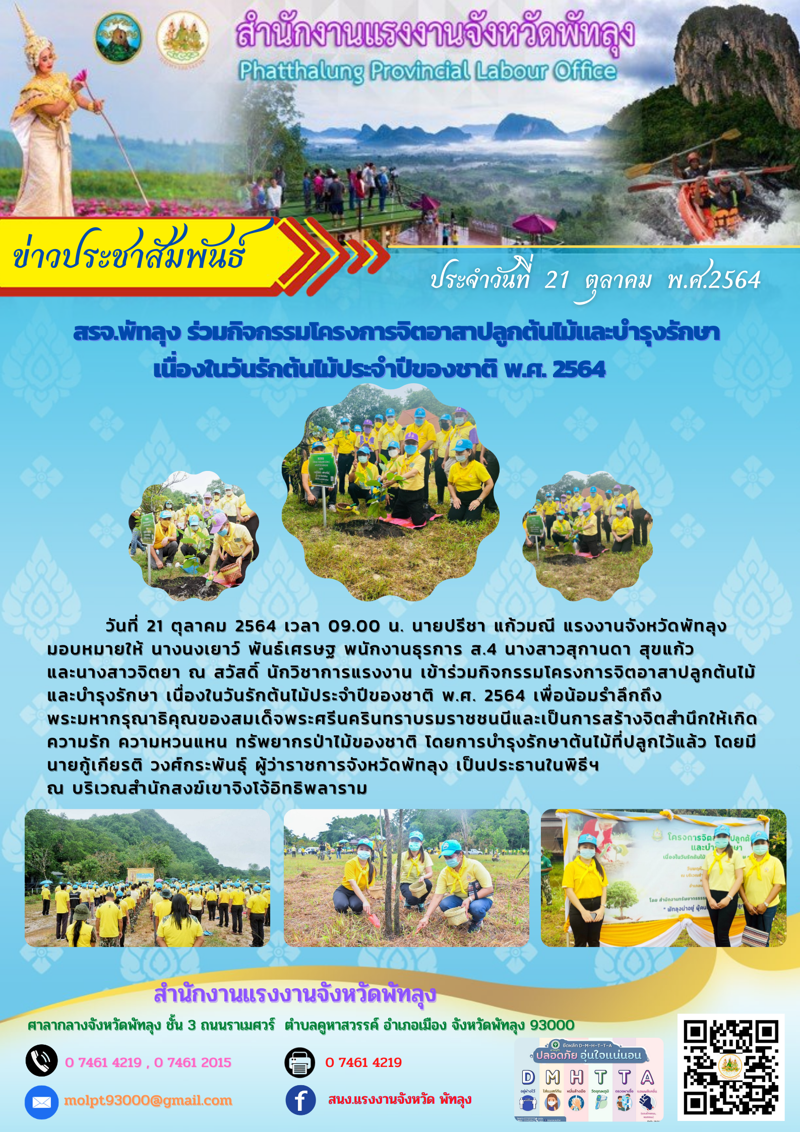 วันที่ 21 ตุลาคม 2564 เวลา 09.00 น. นายปรีชา แก้วมณี แรงงานจังหวัดพัทลุง มอบหมายให้ นางนงเยาว์ พันธ์เศรษฐ พนักงานธุรการ ส.4 นางสาวสุกานดา สุขแก้ว และนางสาวจิตยา ณ สวัสดิ์ นักวิชาการแรงงาน เข้าร่วมกิจกรรมโครงการจิตอาสาปลูกต้นไม้ และบำรุงรักษา เนื่องในวันรักต้นไม้ประจำปีของชาติ พ.ศ. 2564 เพื่อน้อมรำลึกถึง พระมหากรุณาธิคุณของสมเด็จพระศรีนครินทราบรมราชชนนีและเป็นการสร้างจิตสำนึกให้เกิดความรัก ความหวนแหน ทรัพยากรป่าไม้ของชาติ โดยการบำรุงรักษาต้นไม้ที่ปลูกไว้แล้ว โดยมี นายกู้เกียรติ วงศ์กระพันธุ์ ผู้ว่าราชการจังหวัดพัทลุง เป็นประธานในพิธีฯ ณ บริเวณสำนักสงฆ์เขาจิงโจ้อิทธิพลาราม