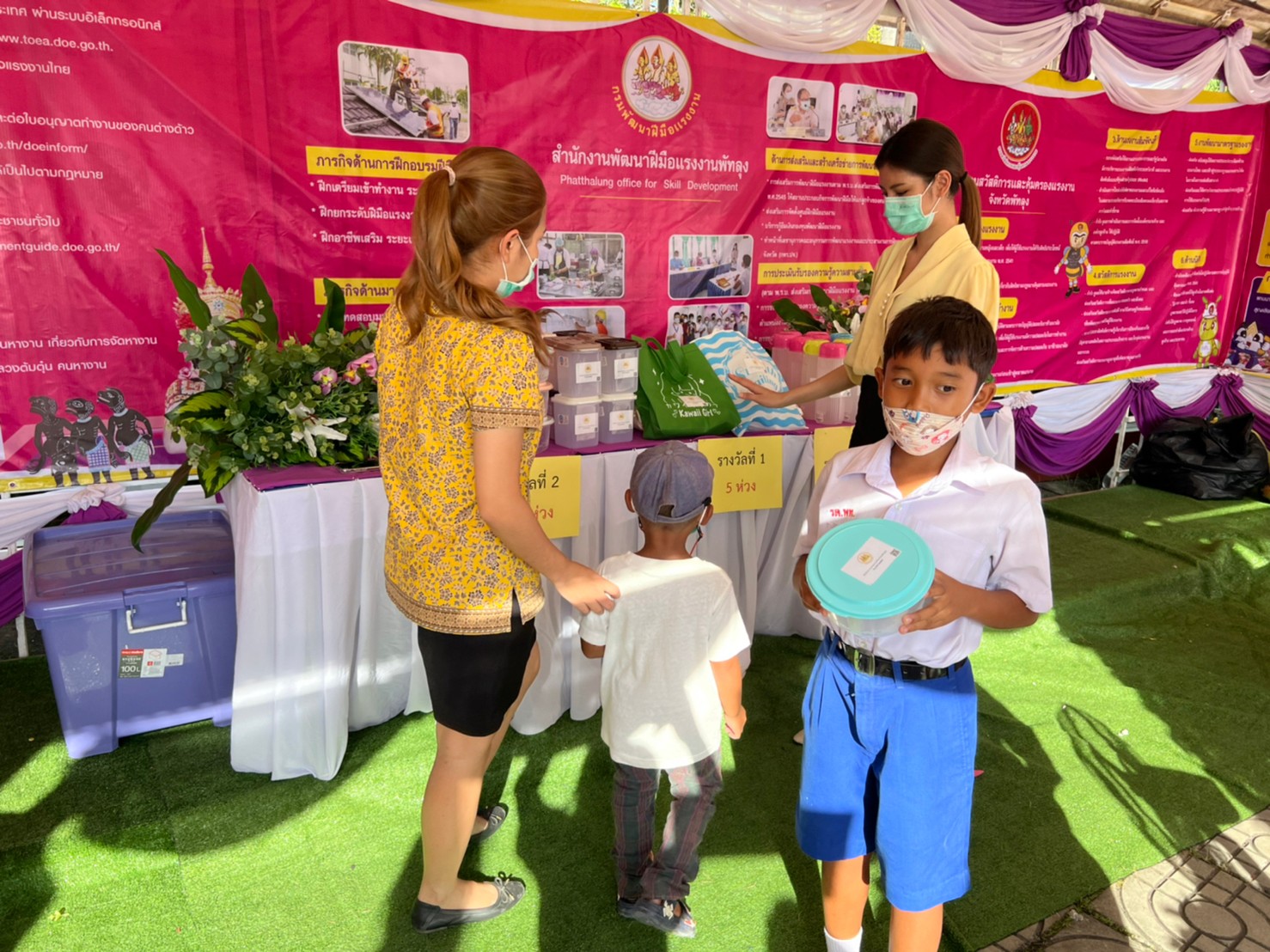 วันที่ 12 – 13 มิถุนายน 2565 นายปรีชา แก้วมณี แรงงานจังหวัดพัทลุง มอบหมายเจ้าหน้าที่สำนักงานแรงงานจังหวัดพัทลุง ร่วมจัดบูธนิทรรศการกระทรวงแรงงาน ในงานสมโภชพระพุทธนิรโรคันตรายชัยวัฒน์จตุรทิศและงานกาชาดประจำปี ของดีเมืองลุง ประจำปี พ.ศ.2565 โดยในงานมีการจัดนิทรรศการให้ความรู้บทบาท หน้าที่ ภารกิจ ของหน่วยงานสังกัดกระทรวงแรงงานจังหวัดพัทลุง การออกร้านจำหน่ายผลิตภัณฑ์ของกลุ่มอาชีพหน่วยบริการชุมชนแรงงานนอกระบบ และกิจกรรมเล่นเกมส์มอบของรางวัลให้กับผู้เยี่ยมชมบูธนิทรรศการกระทรวงแรงงาน ณ บริเวณหน้าศาลากลางจังหวัดพัทลุง
