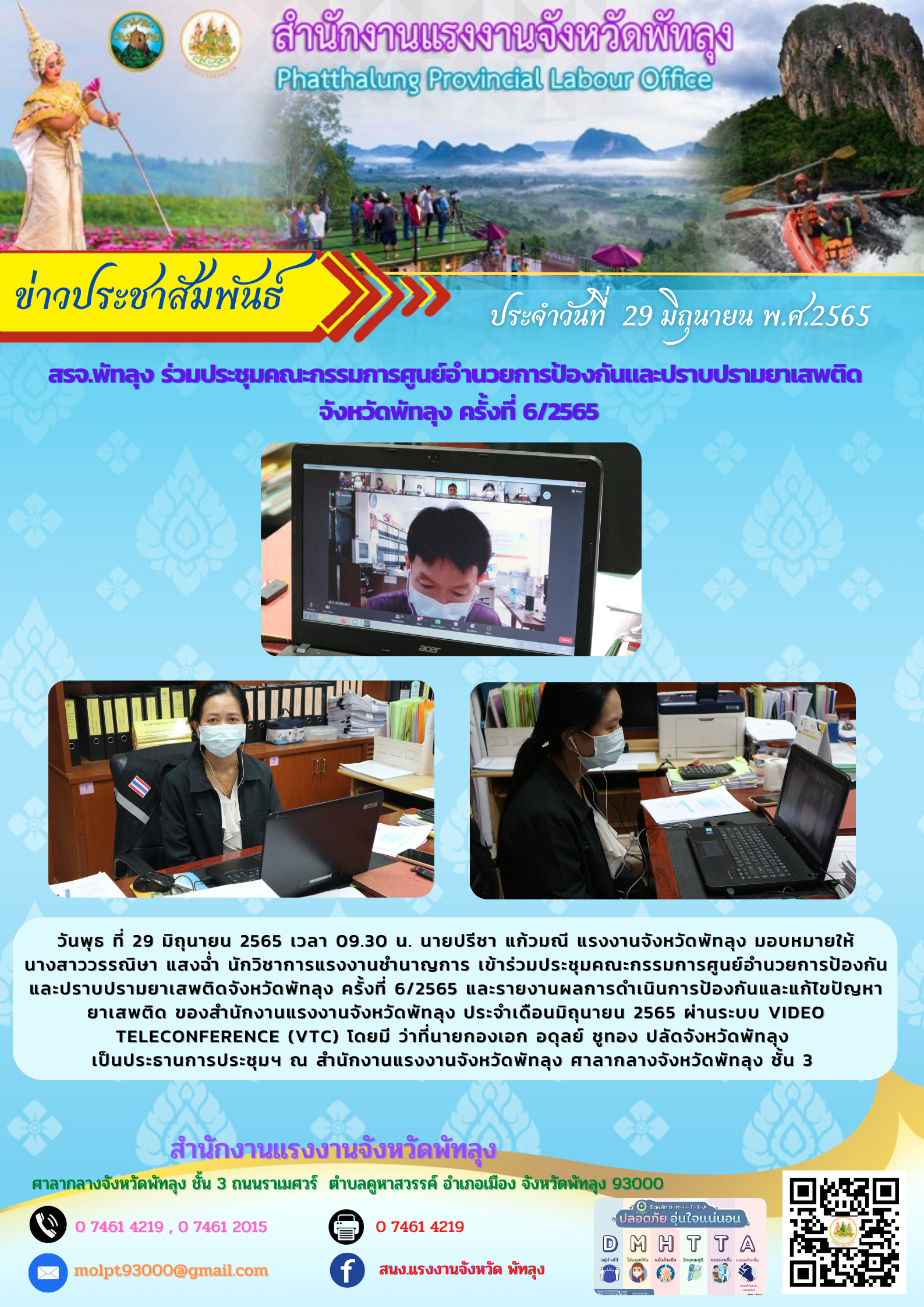 วันพุธ ที่ 29 มิถุนายน 2565 เวลา 09.30 น. นายปรีชา แก้วมณี แรงงานจังหวัดพัทลุง มอบหมายให้ นางสาววรรณิษา แสงฉ่ำ นักวิชาการแรงงานชำนาญการ เข้าร่วมประชุมคณะกรรมการศูนย์อำนวยการป้องกันและปราบปรามยาเสพติดจังหวัดพัทลุง ครั้งที่ 6/2565 และรายงานผลการดำเนินการป้องกันและแก้ไขปัญหายาเสพติด ของสำนักงานแรงงานจังหวัดพัทลุง ประจำเดือนมิถุนายน 2565 ผ่านระบบ Video teleconference (VTC) โดยมี ว่าที่นายกองเอก อดุลย์ ชูทอง ปลัดจังหวัดพัทลุง เป็นประธานการประชุมฯ ณ สำนักงานแรงงานจังหวัดพัทลุง ศาลากลางจังหวัดพัทลุง ชั้น 3
