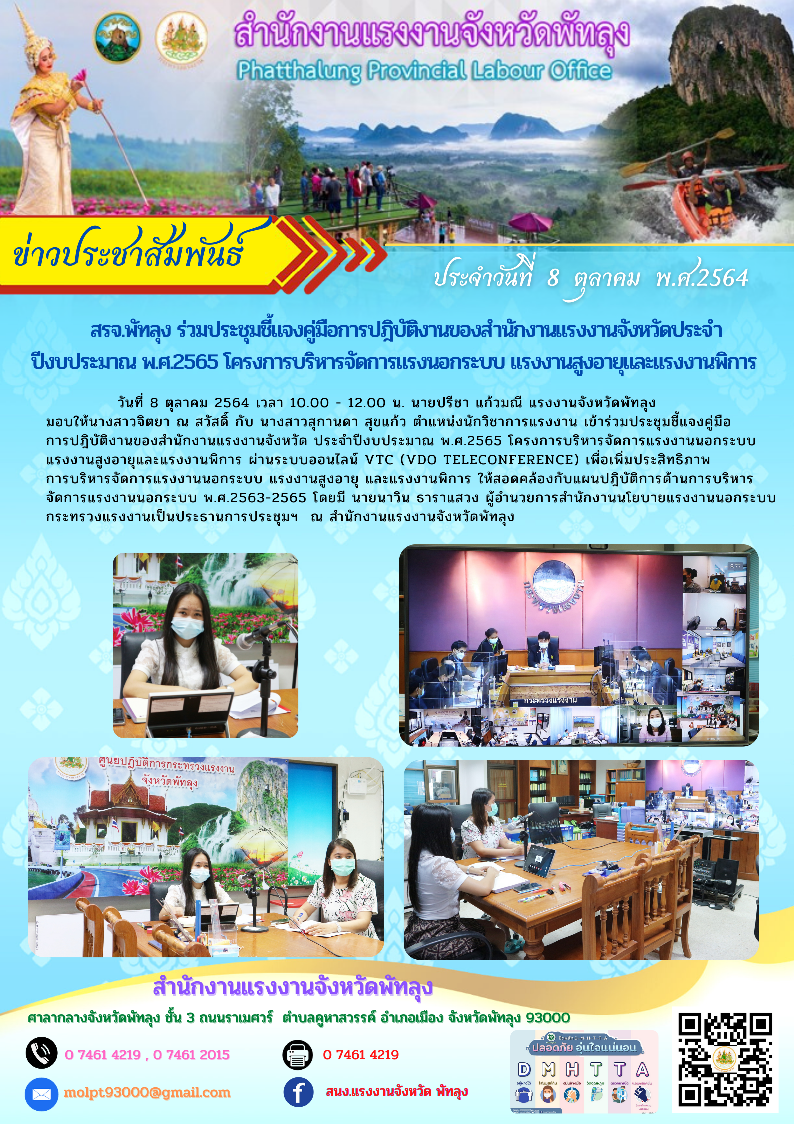 วันที่ 8 ตุลาคม 2564 เวลา 10.00 – 12.00 น. นายปรีชา แก้วมณี แรงงานจังหวัดพัทลุง มอบให้นางสาวจิตยา ณ สวัสดิ์ กับ นางสาวสุกานดา สุขแก้ว ตำแหน่งนักวิชาการแรงงาน เข้าร่วมประชุมชี้แจงคู่มือ การปฎิบัติงานของสำนักงานแรงงานจังหวัด ประจำปีงบประมาณ พ.ศ.2565 โครงการบริหารจัดการแรงงานนอกระบบ แรงงานสูงอายุและแรงงานพิการ ผ่านระบบออนไลน์ VTC (VDO Teleconference) เพื่อเพิ่มประสิทธิภาพ การบริหารจัดการแรงงานนอกระบบ แรงงานสูงอายุ และแรงงานพิการ ให้สอดคล้องกับแผนปฎิบัติการด้านการบริหารจัดการแรงงานนอกระบบ พ.ศ.2563-2565 โดยมี นายนาวิน ธาราแสวง ผู้อำนวยการสำนักงานนโยบายแรงงานนอกระบบ กระทรวงแรงงานเป็นประธานการประชุมฯ ณ สำนักงานแรงงานจังหวัดพัทลุง