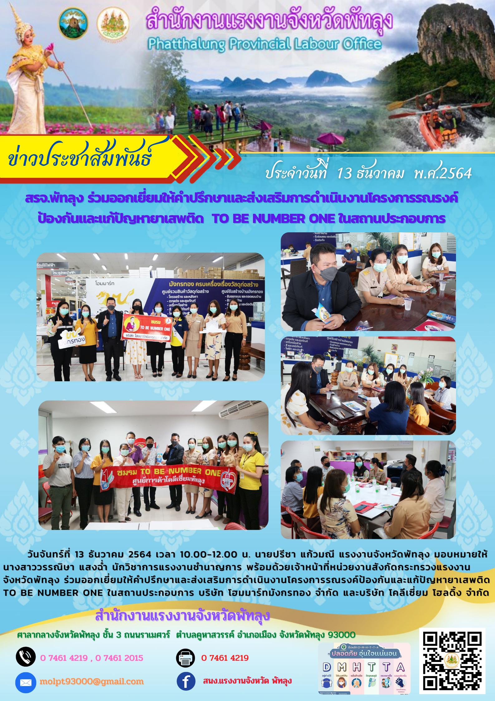 วันจันทร์ที่ 13 ธันวาคม 2564 เวลา 10.00-12.00 น. นายปรีชา แก้วมณี แรงงานจังหวัดพัทลุง มอบหมายให้นางสาววรรณิษา แสงฉ่ำ นักวิชาการแรงงานชำนาญการ พร้อมด้วยเจ้าหน้าที่หน่วยงานสังกัดกระทรวงแรงงานจังหวัดพัทลุง ร่วมออกเยี่ยมให้คำปรึกษาและส่งเสริมการดำเนินงานโครงการรณรงค์ป้องกันและแก้ปัญหายาเสพติด To BE Number ONE ในสถานประกอบการ บริษัท โฮมมาร์ทมังกรทอง จำกัด และบริษัท โคลีเซี่ยม โฮลดิ้ง จำกัด