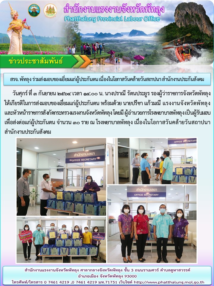 วันศุกร์ ที่ 3 กันยายน 2564 เวลา 14.00 น. นางปราณี รัตนประยูร รองผู้ว่าราชการจังหวัดพัทลุง ให้เกียรติในการส่งมอบของเยี่ยมแก่ผู้ประกันตน พร้อมด้วย นายปรีชา แก้วมณี แรงงานจังหวัดพัทลุงและหัวหน้าราชการสังกัดกระทรวงแรงงานจังหวัดพัทลุง โดยมี ผู้อำนวยการโรงพยาบาลพัทลุง เป็นผู้รับมอบ เพื่อส่งต่อแก่ผู้ประกันตน จำนวน 30 ราย ณ โรงพยาบาลพัทลุง เนื่องในโอกาสวันคล้ายวันสถาปนา สำนักงานประกันสังคม