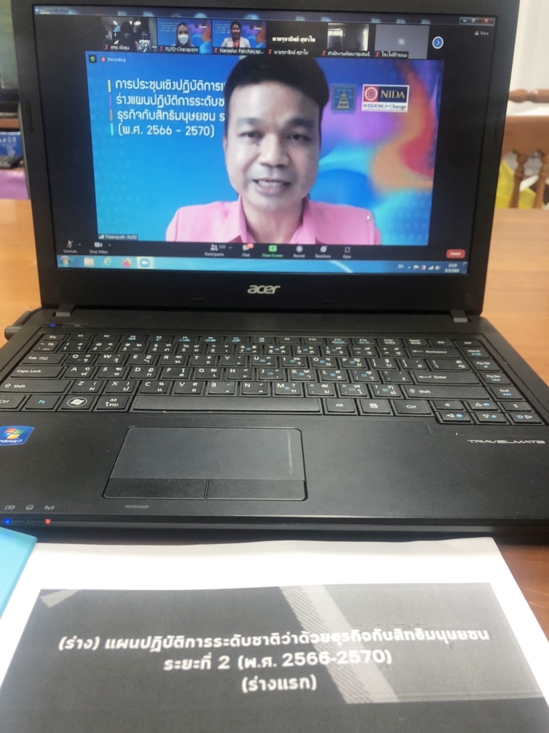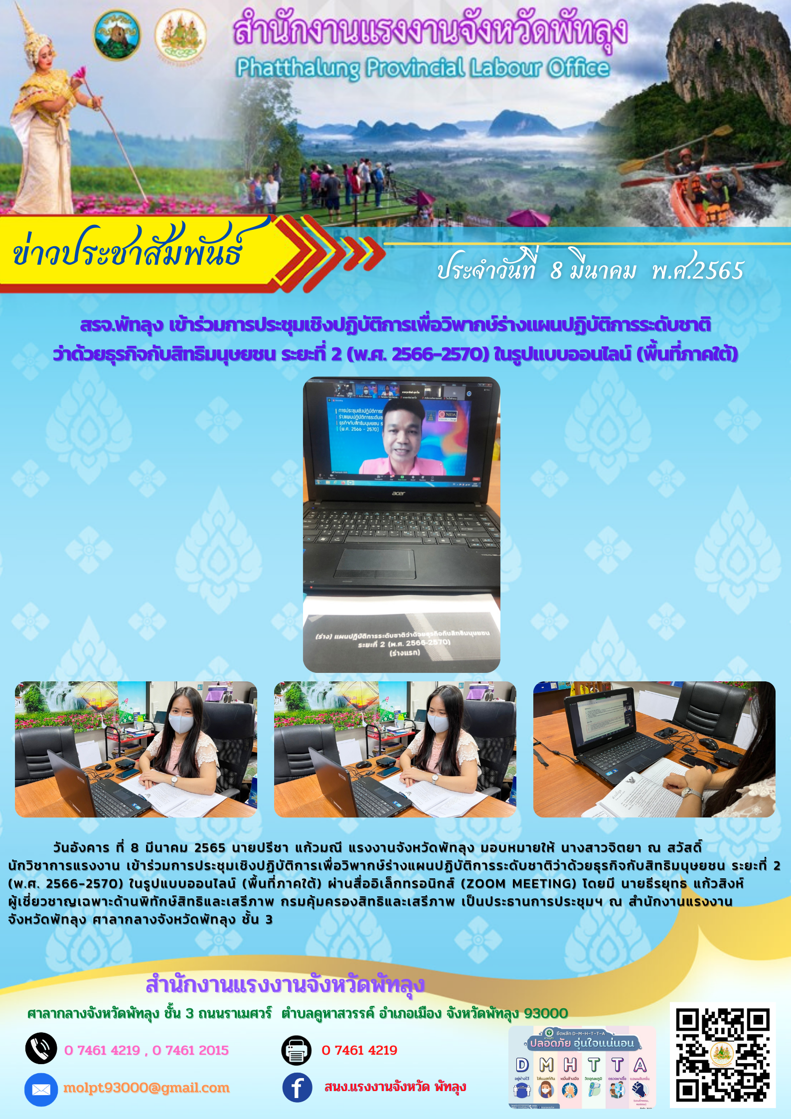 วันอังคาร ที่ 8 มีนาคม 2565 นายปรีชา แก้วมณี แรงงานจังหวัดพัทลุง มอบหมายให้ นางสาวจิตยา ณ สวัสดิ์ นักวิชาการแรงงาน เข้าร่วมการประชุมเชิงปฏิบัติการเพื่อวิพากษ์ร่างแผนปฏิบัติการระดับชาติว่าด้วยธุรกิจกับสิทธิมนุษยชน ระยะที่ 2 (พ.ศ. 2566-2570) ในรูปแบบออนไลน์ (พื้นที่ภาคใต้) ผ่านสื่ออิเล็กทรอนิกส์ (Zoom Meeting) โดยมี นายธีรยุทธ แก้วสิงห์ ผู้เชี่ยวชาญเฉพาะด้านพิทักษ์สิทธิและเสรีภาพ กรมคุ้มครองสิทธิและเสรีภาพ เป็นประธานการประชุมฯ ณ สำนักงานแรงงานจังหวัดพัทลุง ศาลากลางจังหวัดพัทลุง ชั้น 3