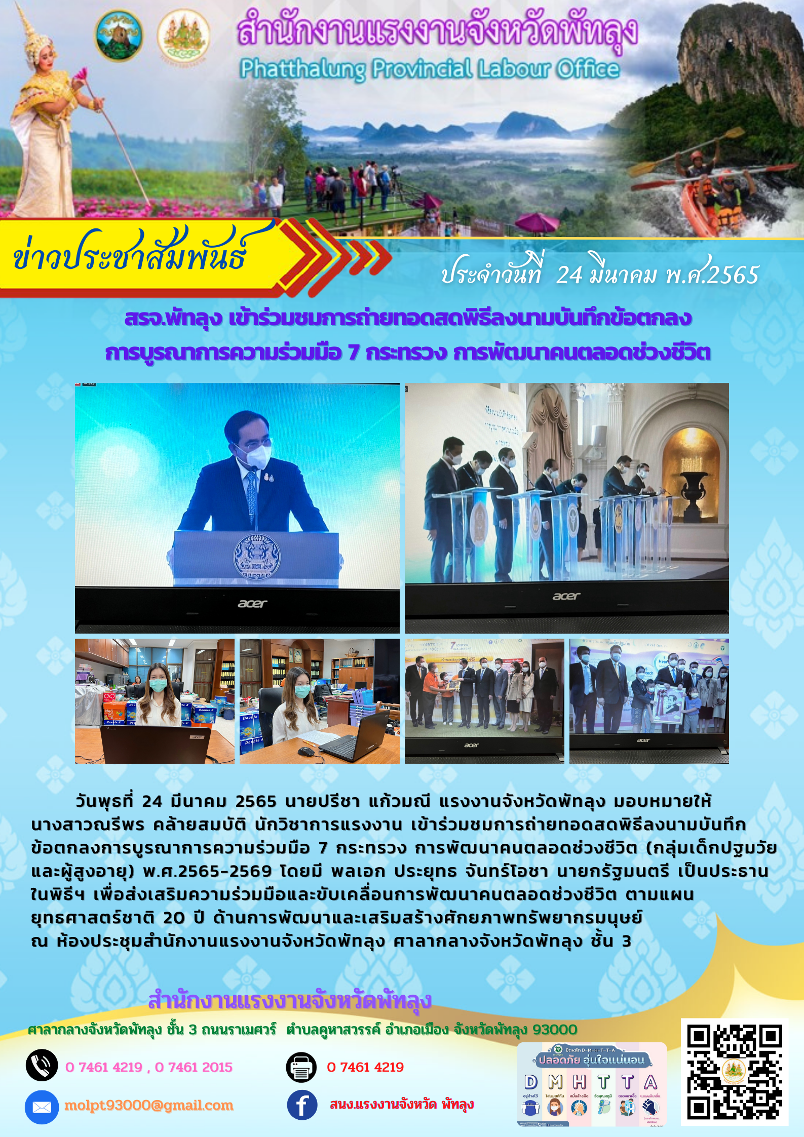 วันพุธที่ 24 มีนาคม 2565 นายปรีชา แก้วมณี แรงงานจังหวัดพัทลุง มอบหมายให้ นางสาวณรีพร คล้ายสมบัติ นักวิชาการแรงงาน เข้าร่วมชมการถ่ายทอดสดพิธีลงนามบันทึกข้อตกลงการบูรณาการความร่วมมือ 7 กระทรวง การพัฒนาคนตลอดช่วงชีวิต (กลุ่มเด็กปฐมวัย และผู้สูงอายุ) พ.ศ.2565-2569 โดยมี พลเอก ประยุทธ จันทร์โอชา นายกรัฐมนตรี เป็นประธานในพิธีฯ เพื่อส่งเสริมความร่วมมือและขับเคลื่อนการพัฒนาคนตลอดช่วงชีวิต ตามแผนยุทธศาสตร์ชาติ 20 ปี ด้านการพัฒนาและเสริมสร้างศักยภาพทรัพยากรมนุษย์ ณ ห้องประชุมสำนักงานแรงงานจังหวัดพัทลุง ศาลากลางจังหวัดพัทลุง ชั้น 3