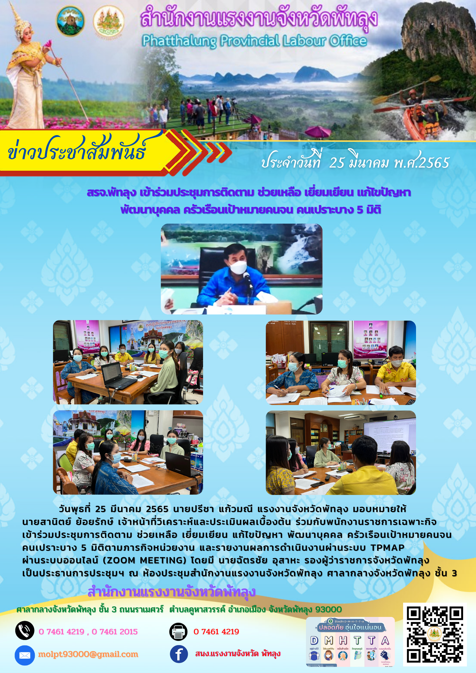 วันพุธที่ 25 มีนาคม 2565 นายปรีชา แก้วมณี แรงงานจังหวัดพัทลุง มอบหมายให้ นายสานิตย์ ย้อยรักษ์ เจ้าหน้าที่วิเคราะห์และประเมินผลเบื้องต้น ร่วมกับพนักงานราชการเฉพาะกิจ เข้าร่วมประชุมการติดตาม ช่วยเหลือ เยี่ยมเยียน แก้ไขปัญหา พัฒนาบุคคล ครัวเรือนเป้าหมายคนจน คนเปราะบาง 5 มิติตามภารกิจหน่วยงาน และรายงานผลการดำเนินงานผ่านระบบ TPMAP ผ่านระบบออนไลน์ (Zoom meeting) โดยมี นายฉัตรชัย อุสาหะ รองผู้ว่าราชการจังหวัดพัทลุง เป็นประธานการประชุมฯ ณ ห้องประชุมสำนักงานแรงงานจังหวัดพัทลุง ศาลากลางจังหวัดพัทลุง ชั้น 3