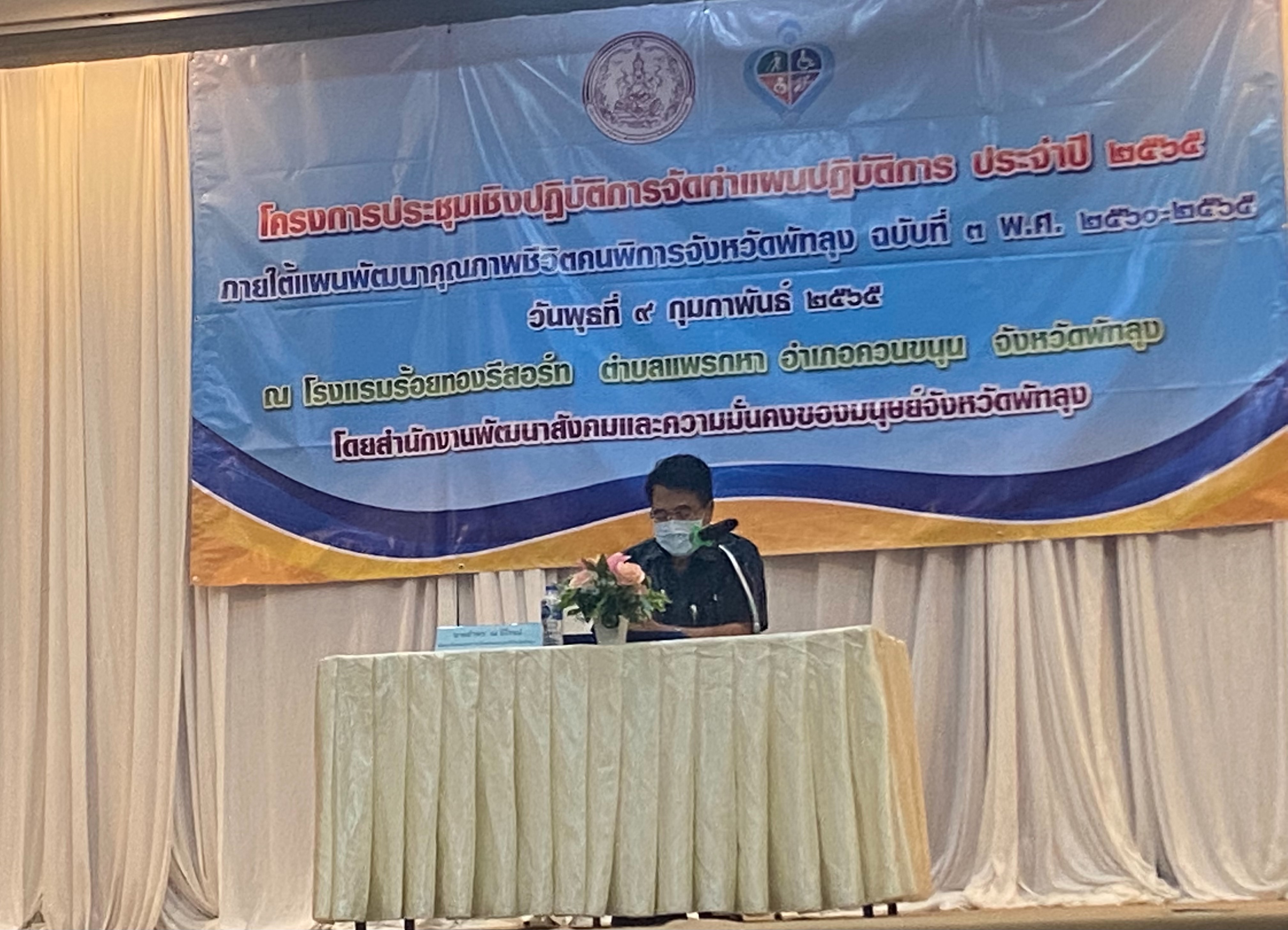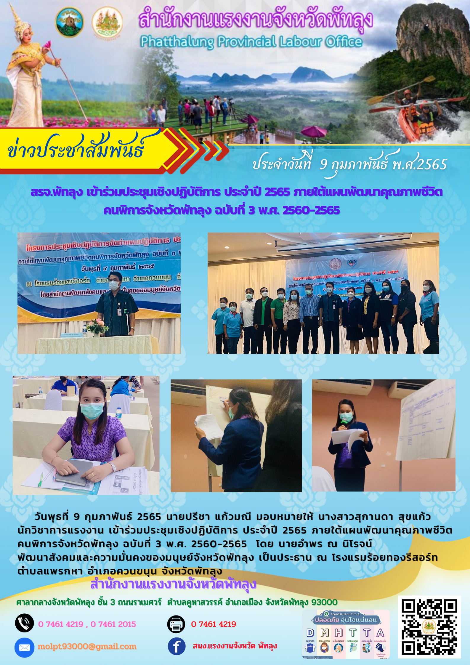 วันพุธที่ 9 กุมภาพันธ์ 2565 นายปรีชา แก้วมณี มอบหมายให้ นางสาวสุกานดา สุขแก้วนักวิชาการแรงงาน เข้าร่วมประชุมเชิงปฏิบัติการ ประจำปี 2565 ภายใต้แผนพัฒนาคุณภาพชีวิตคนพิการจังหวัดพัทลุง ฉบับที่ 3 พ.ศ. 2560-2565 โดย นายอำพร ณ นิโรจน์ พัฒนาสังคมและความมั่นคงของมนุษย์จังหวัดพัทลุง เป็นประธาน ณ โรงแรมร้อยทองรีสอร์ท ตำบลแพรกหา อำเภอควนขนุน จังหวัดพัทลุง