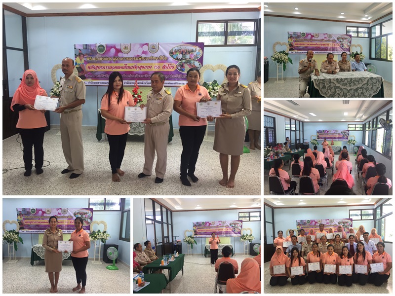 วันจันทร์ที่ 11 มีนาคม 2562 นางอมรวรรณ ช่วงเพ็ชจินดา แรงงานจังหวัดพัทลุง พร้อมด้วยนายอุทิพย์ อินทรเพชร ผู้อำนวยการสำนักงานพัฒนาฝีมือแรงงานพัทลุง และนายพิลือ เขียวแก้ว นักวิชาการสาธารณสุขชำนาญการ ร่วมพิธีมอบวุฒิบัตรให้กับผู้ผ่านการฝึกอบรม โครงการแก้ไขปัญหาความเดือดร้อนด้านอาชีพ จังหวัดพัทลุง ประจำปีงบประมาณ พ.ศ.2562 กิจกรรมพัฒนาทักษะฝีมือเพื่อบรรเทาความเดือดร้อนด้านอาชีพ หลักสูตร นวดแผนไทยเพื่อสุขภาพ (150 ชั่วโมง) ณ โรงพยาบาลส่งเสริมสุขภาพตำบลบ้านหนองบ่อ ตำบลโคกสัก อำเภอบางแก้ว จังหวัดพัทลุง