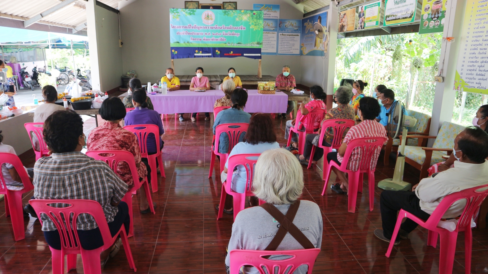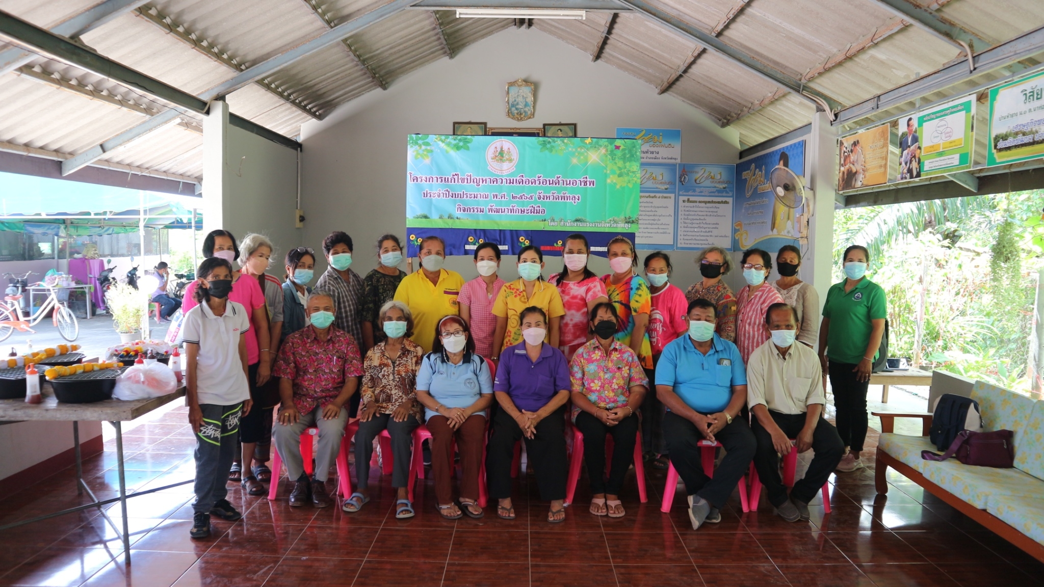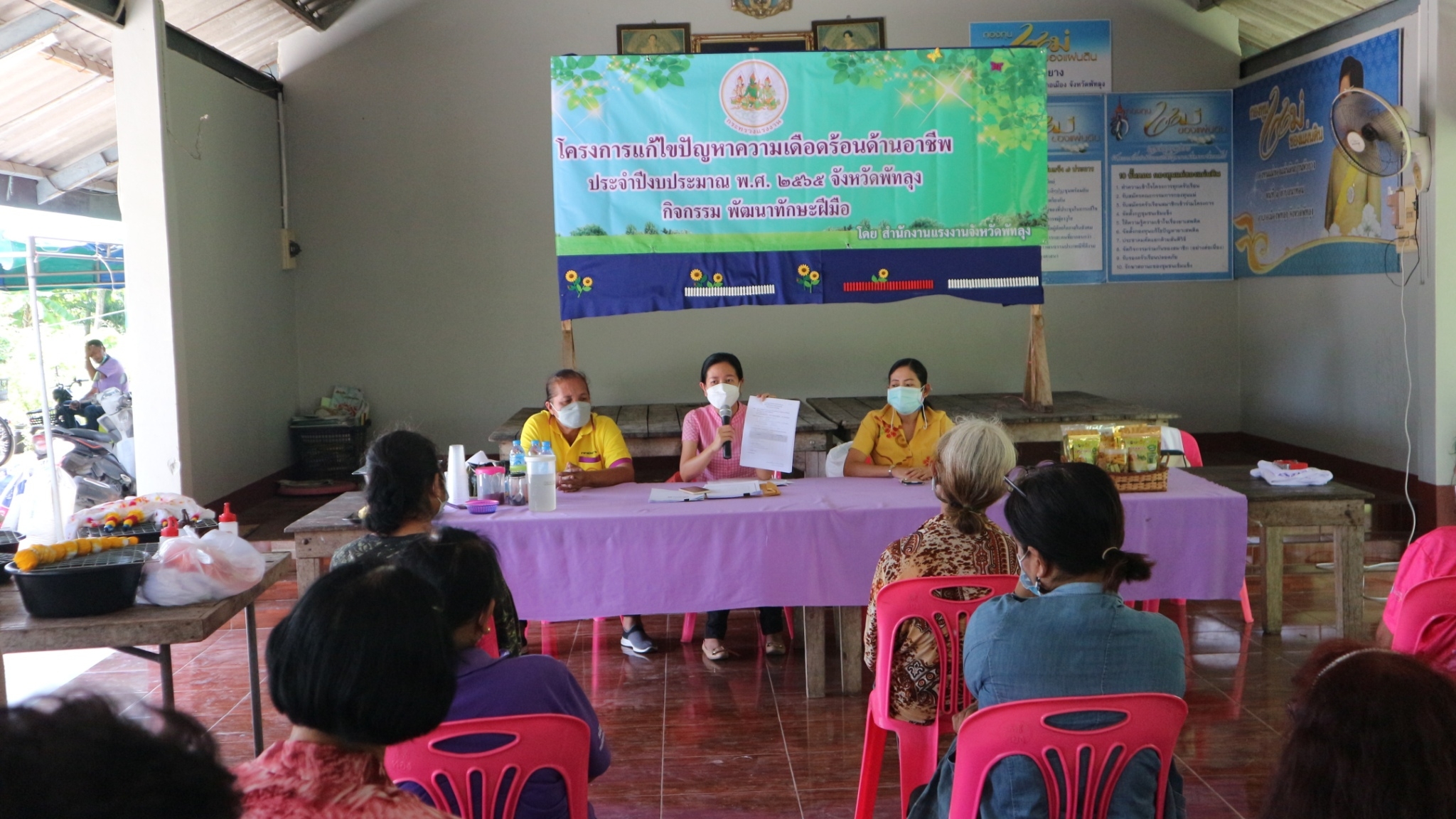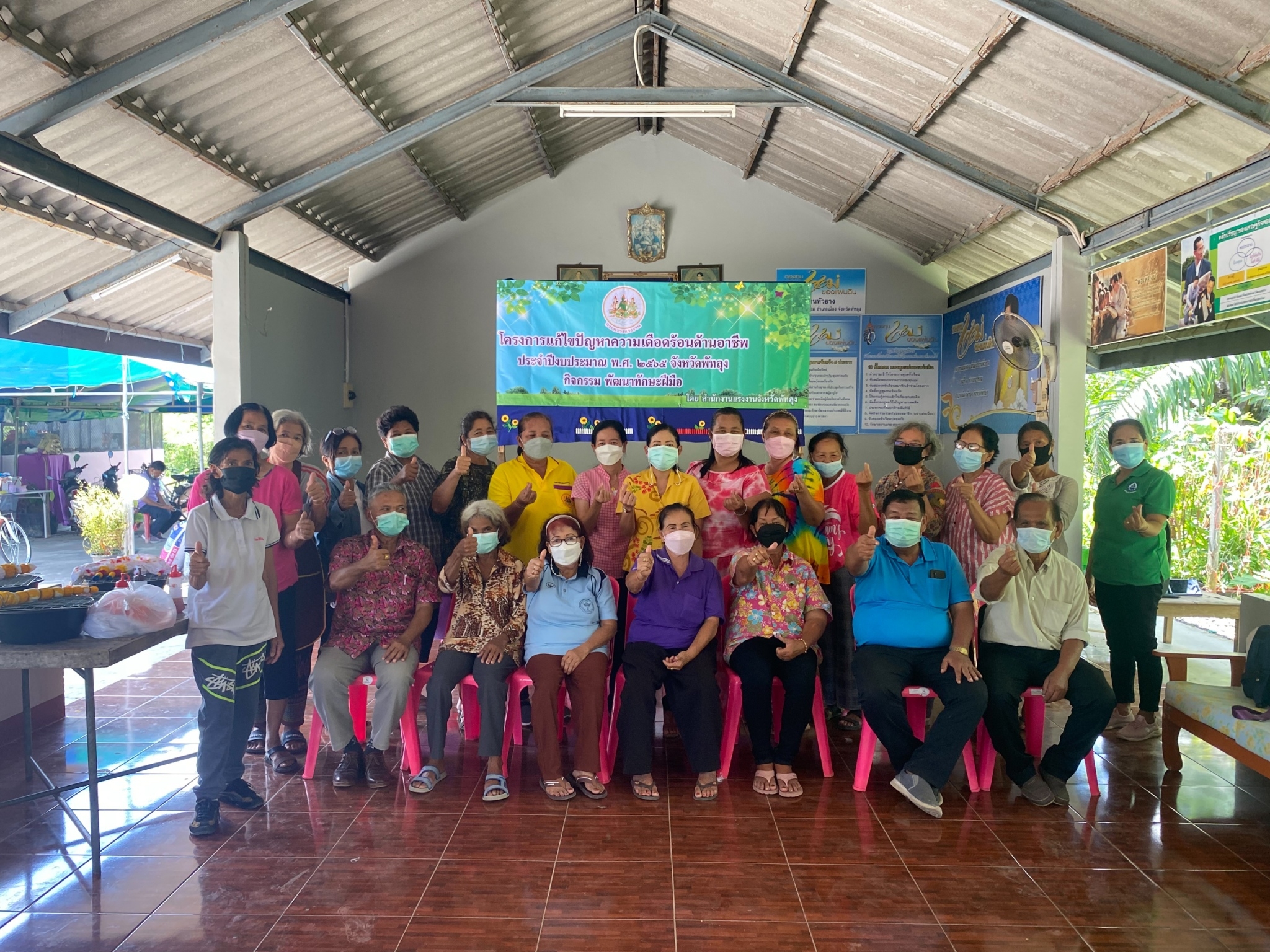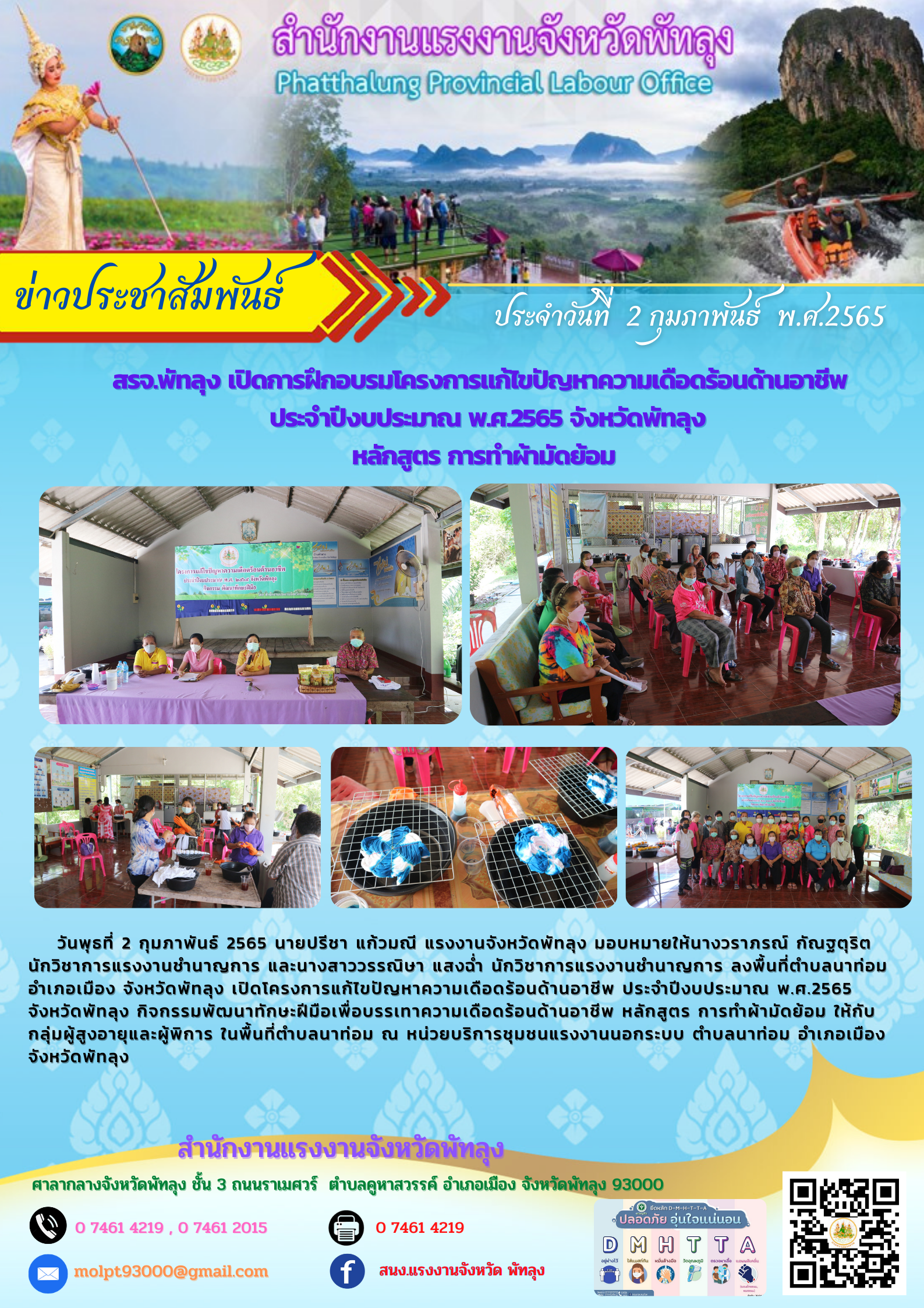 วันพุธที่ 2 กุมภาพันธ์ 2565 นายปรีชา แก้วมณี แรงงานจังหวัดพัทลุง มอบหมายให้นางวราภรณ์ กัณฐตุริต นักวิชาการแรงงานชำนาญการ และนางสาววรรณิษา แสงฉ่ำ นักวิชาการแรงงานชำนาญการ ลงพื้นที่ตำบลนาท่อมอำเภอเมือง จังหวัดพัทลุง เปิดโครงการแก้ไขปัญหาความเดือดร้อนด้านอาชีพ ประจำปีงบประมาณ พ.ศ.2565จังหวัดพัทลุง กิจกรรมพัฒนาทักษะฝีมือเพื่อบรรเทาความเดือดร้อนด้านอาชีพ หลักสูตร การทำผ้ามัดย้อม ให้กับกลุ่มผู้สูงอายุและผู้พิการ ในพื้นที่ตำบลนาท่อม ณ หน่วยบริการชุมชนแรงงานนอกระบบ ตำบลนาท่อม อำเภอเมือง จังหวัดพัทลุง