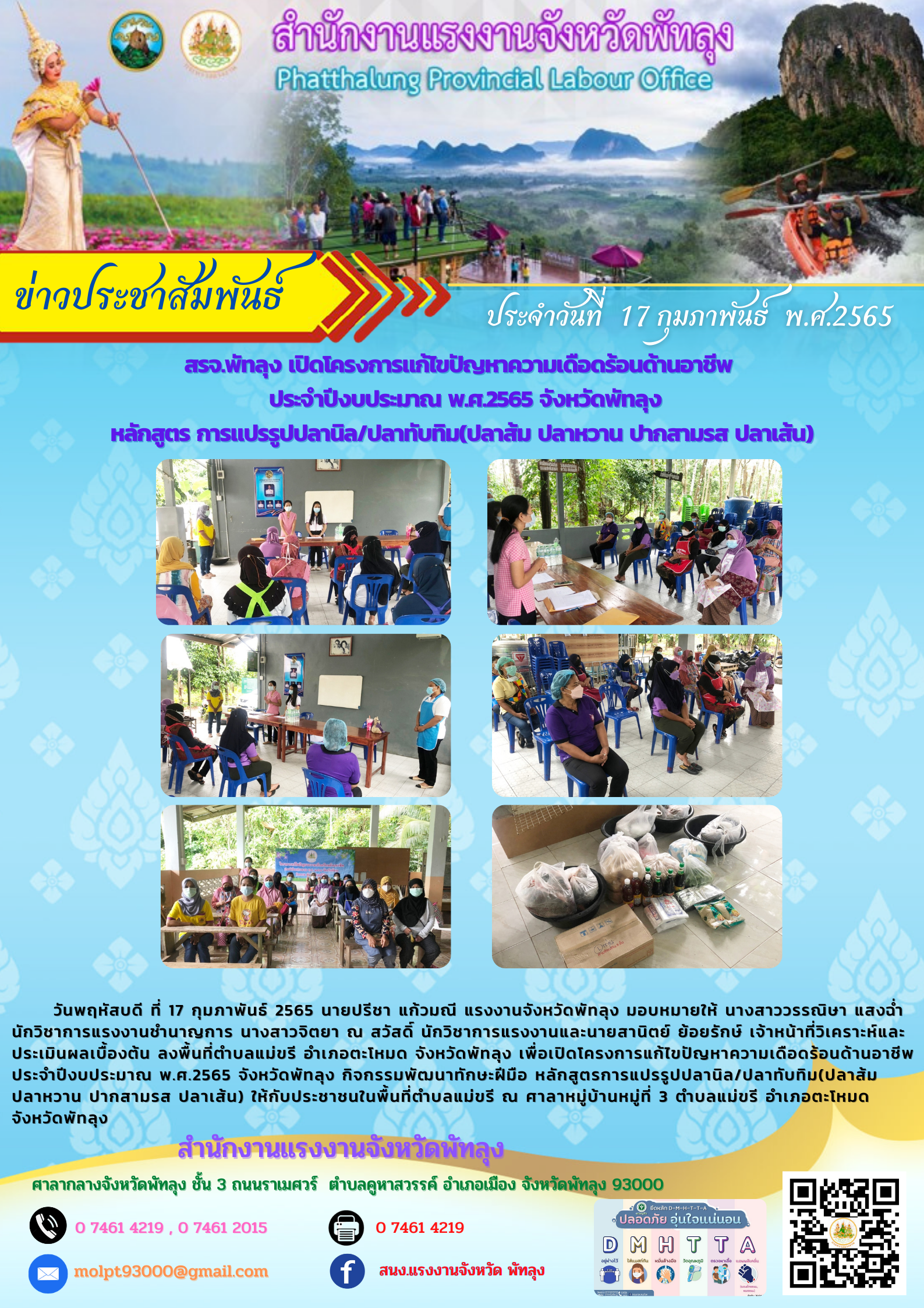 วันพฤหัสบดี ที่ 17 กุมภาพันธ์ 2565 นายปรีชา แก้วมณี แรงงานจังหวัดพัทลุง มอบหมายให้ นางสาววรรณิษา แสงฉ่ำ นักวิชาการแรงงานชำนาญการ นางสาวจิตยา ณ สวัสดิ์ นักวิชาการแรงงาน และนายสานิตย์ ย้อยรักษ์ เจ้าหน้าที่วิเคราะห์และประเมินผลเบื้องต้น ลงพื้นที่ตำบลแม่ขรี อำเภอตะโหมด จังหวัดพัทลุง เพื่อเปิดโครงการแก้ไขปัญหาความเดือดร้อนด้านอาชีพ ประจำปีงบประมาณ พ.ศ.2565 จังหวัดพัทลุง กิจกรรมพัฒนาทักษะฝีมือ หลักสูตรการแปรรูปปลานิล/ปลาทับทิม(ปลาส้ม ปลาหวาน ปากสามรส ปลาเส้น) ให้กับประชาชนในพื้นที่ตำบลแม่ขรี ณ ศาลาหมู่บ้านหมู่ที่ 3 ตำบลแม่ขรี อำเภอตะโหมด จังหวัดพัทลุง