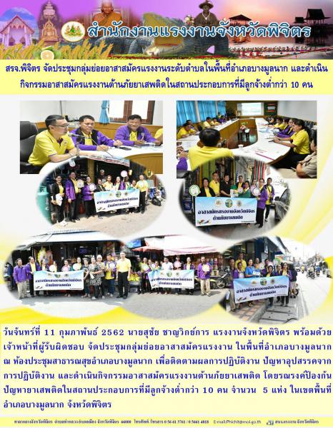 สรจ.พิจิตร จัดประชุมกลุ่มย่อยอาสาสมัครแรงงานระดับตำบลในพื้นที่อำเภอบางมูลนาก และดำเนินกิจกรรมอาสาสมัครแรงงานต้านภัยยาเสพติดในสถานประกอบการที่มีลูกจ้างต่ำกว่า 10 คน