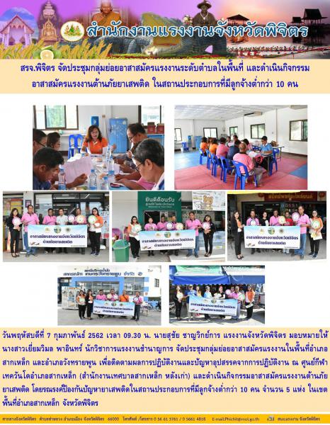 วันพฤหัสบดีที่ 7 กุมภาพันธ์ 2562 เวลา 09.30 น. นายสุชัย ชาญวิกย์การ แรงงานจังหวัดพิจิตร มอบหมายให้ นางสาวเยี่ยมวิมล พาอินทร์ นักวิชาการแรงงานชำนาญการ จัดประชุมกลุ่มย่อยอาสาสมัครแรงงานในพื้นที่อำเภอ สากเหล็ก และอำเภอวังทรายพูน เพื่อติดตามผลการปฏิบัติงานและปัญหาอุปสรรคจากการปฏิบัติงาน ณ ศูนย์กีฬาเทควันโดอำเภอสากเหล็ก (สำนักงานเทศบาลสากเหล็ก หลังเก่า) และดำเนินกิจกรรมอาสาสมัครแรงงานต้านภัยยาเสพติด โดยรณรงค์ป้องกันปัญหายาเสพติดในสถานประกอบการที่มีลูกจ้างต่ำกว่า 10 คน จำนวน 5 แห่ง ในเขตพื้นที่อำเภอสากเหล็ก จังหวัดพิจิตร