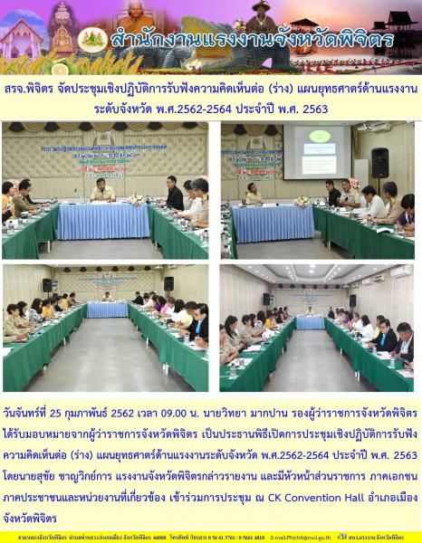 วันจันทร์ที่ 25 กุมภาพันธ์ 2562 เวลา 09.00 น. นายวิทยา มากปาน รองผู้ว่าราชการจังหวัดพิจิตร ได้รับมอบหมายจากผู้ว่าราชการจังหวัดพิจิตร เป็นประธานพิธีเปิดการประชุมเชิงปฏิบัติการรับฟังความคิดเห็นต่อ (ร่าง) แผนยุทธศาตร์ด้านแรงงานระดับจังหวัด พ.ศ.2562-2564 ประจำปี พ.ศ. 2563 โดยนายสุชัย ชาญวิกย์การ แรงงานจังหวัดพิจิตรกล่าวรายงาน และมีหัวหน้าส่วนราชการ ภาคเอกชน ภาคประชาชนและหน่วยงานที่เกี่ยวข้อง เข้าร่วมการประชุม ณ CK Convention Hall อำเภอเมือง จังหวัดพิจิตร