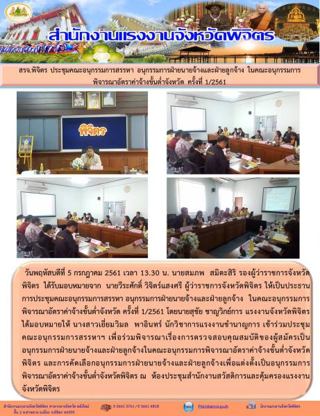 วันพฤหัสบดีที่ 5 กรกฎาคม 2561 เวลา 13.30 น. นายสมภพ สมิตะสิริ รองผู้ว่าราชการจังหวัดพิจิตร ได้รับมอบหมายจาก นายวีระศักดิ์ วิจิตร์แสงศรี ผู้ว่าราชการจังหวัดพิจิตร ให้เป็นประธานการประชุมคณะอนุกรรมการสรรหา อนุกรรมการฝ่ายนายจ้างและฝ่ายลูกจ้าง ในคณะอนุกรรมการพิจารณาอัตราค่าจ้างขั้นต่ำจังหวัด ครั้งที่ 1/2561 โดยนายสุชัย ชาญวิกย์การ แรงงานจังหวัดพิจิตร ได้มอบหมายให้ นางสาวเยี่ยมวิมล พาอินทร์ นักวิชาการแรงงานชำนาญการ เข้าร่วมประชุมคณะอนุกรรมการสรรหาฯ เพื่อร่วมพิจารณาเรื่องการตรวจสอบคุณสมบัติของผู้สมัครเป็นอนุกรรมการฝ่ายนายจ้างและฝ่ายลูกจ้างในคณะอนุกรรมการพิจารณาอัตราค่าจ้างขั้นต่ำจังหวัดพิจิตร และการคัดเลือกอนุกรรมการฝ่ายนายจ้างและฝ่ายลูกจ้างเพื่อแต่งตั้งเป็นอนุกรรมการพิจารณาอัตราค่าจ้างขั้นต่ำจังหวัดพิจิตร ณ ห้องประชุมสำนักงานสวัสดิการและคุ้มครองแรงงานจังหวัดพิจิตร