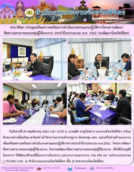 วันอังคารที่ 20 พฤศจิกายน 2561 เวลา 10.30 น. นายสุชัย ชาญวิกย์การ แรงงานจังหวัดพิจิตร พร้อมด้วยนางสาวเยี่ยมวิมล พาอินทร์ นักวิชาการแรงงานชำนาญการ จัดประชุม อสร. และเครือข่ายด้านแรงงาน เพื่อเตรียมความพร้อมการดำเนินงานตามแผนปฏิบัติราชการประจำปีงบประมาณ พ.ศ.2562 : โครงการพัฒนาขีดความสามารถของกลุ่มผู้ใช้แรงงาน ; กิจกรรมพัฒนาขีดความสามารถของกลุ่มผู้ใช้แรงงาน (ซึ่งได้รับอนุมัติโครงการฯ ให้พัฒนาทักษะฝีมือแรงงานในระบบ และแรงงานนอกระบบ รวม 640 คน วงเงินงบประมาณ 1,753,900 บาท) ณ สำนักงานแรงงานจังหวัดพิจิตร (ชั้น 2) ศาลากลางจังหวัดพิจิตร