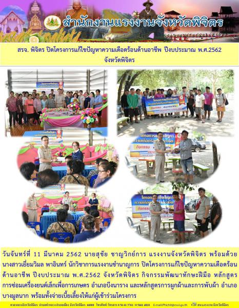 วันจันทร์ที่ 11 มีนาคม 2562 นายสุชัย ชาญวิกย์การ แรงงานจังหวัดพิจิตร พร้อมด้วยนางสาวเยี่ยมวิมล พาอินทร์ นักวิชาการแรงงานชำนาญการ ปิดโครงการแก้ไขปัญหาความเดือดร้อนด้านอาชีพปีงบประมาณ พ.ศ.2562 จังหวัดพิจิตร กิจกรรมพัฒนาทักษะฝีมือ หลักสูตร การซ่อมเครื่องยนต์เล็กเพื่อการเกษตร อำเภอบึงนาราง และหลักสูตรการผูกผ้าและการพับผ้า อำเภอบางมูลนาก พร้อมทั้งจ่ายเบี้ยเลี้ยงให้แก่ผู้เข้าร่วมโครงการ