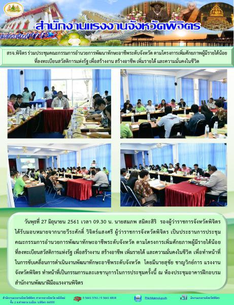 วันพุธที่ 27 มิถุนายน 2561 เวลา 09.30 น. นายสมภพ สมิตะสิริ รองผู้ว่าราชการจังหวัดพิจิตร ได้รับมอบหมายจากนายวีระศักดิ์ วิจิตร์แสงศรี ผู้ว่าราชการจังหวัดพิจิตร เป็นประธานการประชุมคณะกรรมการอำนวยการพัฒนาทักษะอาชีพระดับจังหวัด ตามโครงการเพิ่มศักยภาพผู้มีรายได้น้อยที่ลงทะเบียนสวัสดิการแห่งรัฐ เพื่อสร้างงาน สร้างอาชีพ เพิ่มรายได้ และความมั่นคงในชีวิต เพื่อทำหน้าที่ในการขับเคลื่อนการดำเนินงานพัฒนาทักษะอาชีพระดับจังหวัด โดยมีนายสุชัย ชาญวิกย์การ แรงงานจังหวัดพิจิตร ทำหน้าที่เป็นกรรมการและเลขานุการในการประชุมครั้งนี้ ณ ห้องประชุมอาคารฝึกอบรมสำนักงานพัฒนาฝีมือแรงงานพิจิตร