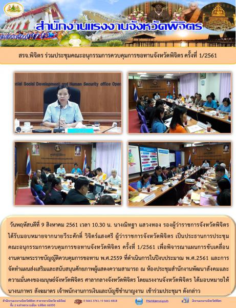 วันพฤหัสบดีที่ 9 สิงหาคม 2561 เวลา 10.30 น. นางณิทฐา แสวงทอง รองผู้ว่าราชการจังหวัดพิจิตร ได้รับมอบหมายจากนายวีระศักดิ์ วิจิตร์แสงศรี ผู้ว่าราชการจังหวัดพิจิตร เป็นประธานการประชุมคณะอนุกรรมการควบคุมการขอทานจังหวัดพิจิตร ครั้งที่ 1/2561 เพื่อพิจารณาแผนการขับเคลื่อนงานตามพระราชบัญญัติควบคุมการขอทาน พ.ศ.2559 ที่ดำเนินการในปีงบประมาณ พ.ศ.2561 และการจัดทำแผนส่งเสริมและสนับสนุนศักยภาพผู้แสดงความสามารถ ณ ห้องประชุมสำนักงานพัฒนาสังคมและความมั่นคงของมนุษย์จังหวัดพิจิตร ศาลากลางจังหวัดพิจิตร โดยแรงงานจังหวัดพิจิตร ได้มอบหมายให้นางนภาพร สังฆมาตร เจ้าพนักงานการเงินและบัญชีชำนาญงาน เข้าร่วมประชุมฯ ดังกล่าว