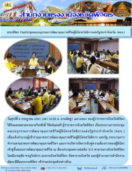 วันศุกร์ที่ 6 กรกฎาคม 2561 เวลา 10.00 น. นางณิทฐา แสวงทอง รองผู้ว่าราชการจังหวัดพิจิตร ได้รับมอบหมายจากนายวีระศักดิ์ วิจิตร์แสงศรี ผู้ว่าราชการจังหวัดพิจิตร เป็นประธานการประชุมคณะอนุกรรมการพัฒนาคุณภาพชีวิตผู้มีบัตรสวัสดิการแห่งรัฐประจำจังหวัด (คอจ.) เพื่อแจ้งจำนวนผู้เข้าร่วมมาตรการพัฒนาคุณภาพชีวิตผู้มีบัตรสวัสดิการ แห่งรัฐ กระบวนการทำงานตามมาตรการพัฒนาคุณภาพชีวิตฯ และการบริหารจัดการจับคู่ความต้องการของผู้มีบัตร เข้าสู่ขั้นตอนการพัฒนาคุณภาพชีวิต ณ ห้องประชุมหลวงพ่อพิธ 3/2 ศาลากลางจังหวัดพิจิตร โดยมีนายสุชัย ชาญวิกย์การ แรงงานจังหวัดพิจิตร จัดหางานจังหวัด และผู้อำนวยการสำนักงานพัฒนาฝีมือแรงงานพิจิตร เข้าร่วมประชุมดังกล่าวด้วย