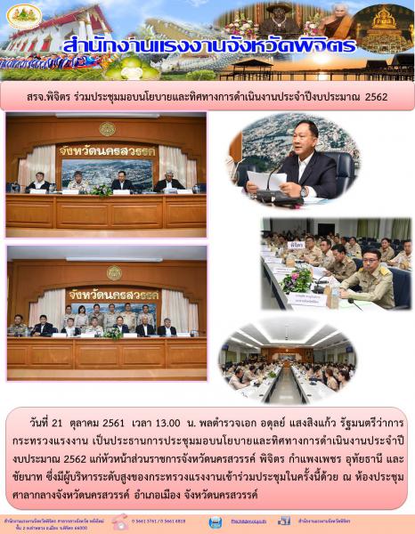 วันที่ 21 ตุลาคม 2561 เวลา 13.00 น. พลตำรวจเอก อดุลย์ แสงสิงแก้ว รัฐมนตรีว่าการกระทรวงแรงงาน เป็นประธานการประชุมมอบนโยบายและทิศทางการดำเนินงานประจำปีงบประมาณ 2562 แก่หัวหน้าส่วนราชการจังหวัดนครสวรรค์ พิจิตร กำแพงเพชร อุทัยธานี และชัยนาท ซึ่งมีผู้บริหารระดับสูงของกระทรวงแรงงานเข้าร่วมประชุมในครั้งนี้ด้วย ณ ห้องประชุมศาลากลางจังหวัดนครสวรรค์ อำเภอเมือง จังหวัดนครสวรรค์