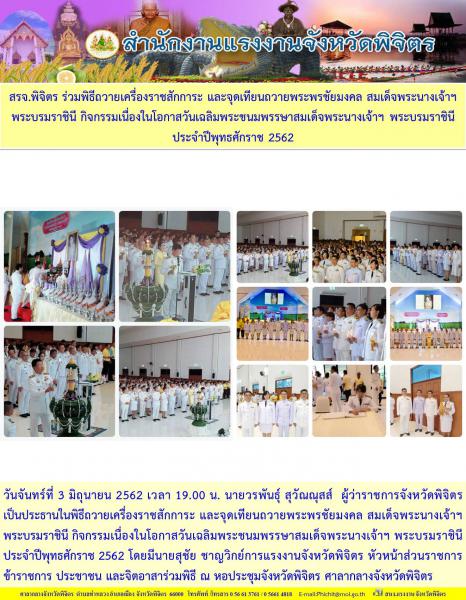 สรจ.พิจิตร ร่วมพิธีถวายเครื่องราชสักการะ และจุดเทียนถวายพระพรชัยมงคล สมเด็จพระนางเจ้าฯ พระบรมราชินี กิจกรรมเนื่องในโอกาสวันเฉลิมพระชนมพรรษาสมเด็จพระนางเจ้าฯ พระบรมราชินี ประจำปีพุทธศักราช 2562