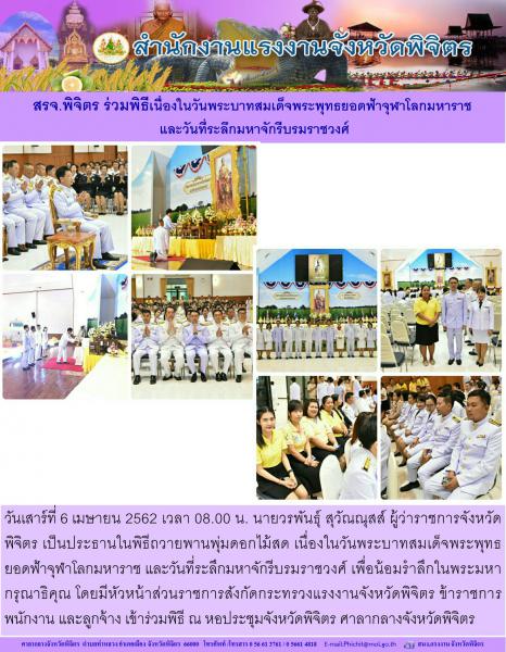วันเสาร์ที่ 6 เมษายน 2562 เวลา 08.00 น. นายวรพันธุ์ สุวัณณุสส์ ผู้ว่าราชการจังหวัดพิจิตร เป็นประธานในพิธีถวายพานพุ่มดอกไม้สด เนื่องในวันพระบาทสมเด็จพระพุทธ ยอดฟ้าจุฬาโลกมหาราช และวันที่ระลึกมหาจักรีบรมราชวงศ์ เพื่อน้อมรำลึกในพระมหากรุณาธิคุณ โดยมีหัวหน้าส่วนราชการสังกัดกระทรวงแรงงานจังหวัดพิจิตร ข้าราชการ พนักงาน และลูกจ้าง เข้าร่วมพิธี ณ หอประชุมจังหวัดพิจิตร ศาลากลางจังหวัดพิจิตร