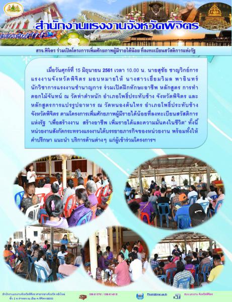 เมื่อวันศุกร์ที่ 15 มิถุนายน 2561 เวลา 10.00 น. นายสุชัย ชาญวิกย์การ แรงงานจังหวัดพิจิตร มอบหมายให้ นางสาวเยี่ยมวิมล พาอินทร์ นักวิชาการแรงงานชำนาญการ ร่วมเปิดฝึกทักษะอาชีพ หลักสูตร การทำดอกไม้จันทน์ ณ วัดท่าตำหนัก อำเภอโพธิ์ประทับช้าง จังหวัดพิจิตร และ หลักสูตรการแปรรูปอาหาร ณ วัดหนองต้นไทร อำเภอโพธิ์ประทับช้าง จังหวัดพิจิตร ตามโครงการเพิ่มศักยภาพผู้มีรายได้น้อยที่ลงทะเบียนสวัสดิการแห่งรัฐ “เพื่อสร้างงาน สร้างอาชีพ เพิ่มรายได้และความมั่นคงในชีวิต” ทั้งนี้หน่วยงานสังกัดกระทรวงแรงงานได้บรรยายภารกิจของหน่วยงาน พร้อมทั้งให้คำปรึกษา แนะนำ บริการด้านต่างๆ แก่ผู้เข้าร่วมโครงการฯ