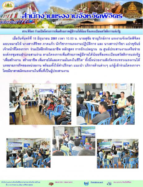 เมื่อวันจันทร์ที่ 18 มิถุนายน 2561 เวลา 10.00 น. นายสุชัย ชาญวิกย์การ แรงงานจังหวัดพิจิตร มอบหมายให้ นางสาวศิริพร ภาคแก้ว นักวิชาการแรงงานปฏิบัติการ และ นางสาวปาริยา แปวขุขันธ์ เจ้าหน้าที่โครงการฯ ร่วมเปิดฝึกทักษะอาชีพ หลักสูตร การถักเปลญวน ณ ศูนย์ประสานงานเครือข่ายองค์กรชุมชนอำเภอสามง่าม ตามโครงการเพิ่มศักยภาพผู้มีรายได้น้อยที่ลงทะเบียนสวัสดิการแห่งรัฐ “เพื่อสร้างงาน สร้างอาชีพ เพิ่มรายได้และความมั่นคงในชีวิต” ทั้งนี้หน่วยงานสังกัดกระทรวงแรงงานได้บรรยายภารกิจของหน่วยงาน พร้อมทั้งให้คำปรึกษา แนะนำ บริการด้านต่างๆ แก่ผู้เข้าร่วมโครงการฯ โดยมีอาสาสมัครแรงงานในพื้นที่เป็นผู้ประสานงาน