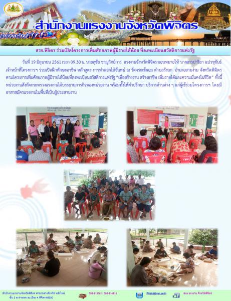 วันที่ 19 มิถุนายน 2561 เวลา 09.30 น. นายสุชัย ชาญวิกย์การ แรงงานจังหวัดพิจิตร มอบหมายให้ นางสาวปาริยา แปวขุขันธ์ เจ้าหน้าที่โครงการฯ ร่วมเปิดฝึกทักษะอาชีพ หลักสูตร การทำดอกไม้จันทน์ ณ วัดจระเข้ผอม ตำบลรังนก อำเภอสามง่าม จังหวัดพิจิตร ตามโครงการเพิ่มศักยภาพผู้มีรายได้น้อยที่ลงทะเบียนสวัสดิการแห่งรัฐ “เพื่อสร้างงาน สร้างอาชีพ เพิ่มรายได้และความมั่นคงในชีวิต” ทั้งนี้หน่วยงานสังกัดกระทรวงแรงงานได้บรรยายภารกิจของหน่วยงาน พร้อมทั้งให้คำปรึกษา บริการด้านต่าง ๆ แก่ผู้เข้ร่วมโครงการฯ โดยมีอาสาสมัครแรงงานในพื้นที่เป็นผู้ประสานงาน