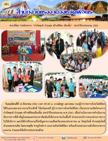 วันพฤหัสบดีที่ 16 สิงหาคม 2561 เวลา 09.30 น. นางณิทฐา แสวงทอง รองผู้ว่าราชการจังหวัดพิจิตร ได้รับมอบหมายจากนายวีระศักดิ์ วิจิตร์แสงศรี ผู้ว่าราชการจังหวัดพิจิตร เป็นประธานเปิดโครงการ บำบัดทุกข์ บำรุงสุข สร้างพิจิตรเมืองยิ้ม ประจำปีงบประมาณ พ.ศ.2561 เพื่อนำนโยบายการดำเนินงาน ข้อราชการที่สำคัญไปเผยแพร่ประชาสัมพันธ์ให้ประชาชนในพื้นที่ นำหน่วยบริการของส่วนราชการ ไปให้บริการ และให้คำปรึกษาแก้ไขปัญหาความเดือดร้อนของประชาชน ณ วัดทุ่งโพธิ์ ตำบลทุ่งโพธิ์ อำเภอตะพานหิน โดยนายสุชัย ชาญวิกย์การ แรงงานจังหวัดพิจิตร พร้อมด้วยหน่วยงานสังกัดกระทรวงแรงงาน ร่วมออกให้บริการประชาชนด้วย
