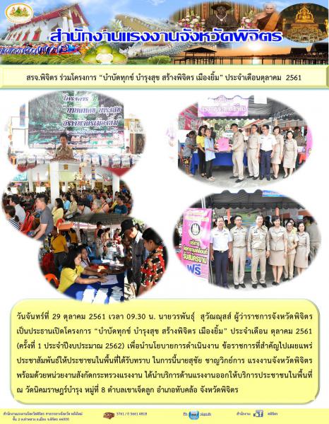 วันจันทร์ที่ 29 ตุลาคม 2561 เวลา 09.30 น. นายวรพันธุ์ สุวัณณุสส์ ผู้ว่าราชการจังหวัดพิจิตร เป็นประธานเปิดโครงการ บำบัดทุกข์ บำรุงสุข สร้างพิจิตร เมืองยิ้มประจำเดือน ตุลาคม (ครั้งที่ 1 ประจำปีงบประมาณ 2562) เพื่อนำนโยบายการดำเนินงาน ข้อราชการที่สำคัญไปเผยแพร่ประชาสัมพันธ์ให้ประชาชนในพื้นที่ได้รับทราบ ในการนี้นายสุชัย ชาญการ แรงงานจังหวัดพิจิตร พร้อมด้วยหน่วยงานสังกัดกระทรวงแรงงาน ได้นำบริการด้านแรงงานออกให้บริการประชาชนในพื้นที่ณ วัดนิคมราษฎร์บำรุง หมู่ที่ 8 ตำบลเขาเจ็ดลูก อำเภอทับคล้อ จังหวัดพิจิตร