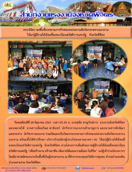 วันพฤหัสบดีที่ 28 มิถุนายน 2561 เวลา 09.30 น. นายสุชัย ชาญวิกย์การ แรงงานจังหวัดพิจิตร มอบหมายให้ นางสาวเยี่ยมวิมล พาอินทร์ นักวิชาการแรงงานชำนาญการ และนางสาวทักษิณา แสงกระจ่าง นักวิชาการแรงงาน ร่วมเปิดและเป็นวิทยากรบรรยายภารกิจของหน่วยงานสังกัดกระทรวงแรงงาน พร้อมทั้งให้คำปรึกษา บริการรับสมัครผู้ประกันตนตามมาตรา 40 ให้แก่ผู้มีรายได้น้อยที่ลงทะเบียนสวัสดิการแห่งรัฐ จังหวัดพิจิตร ตามโครงการเพิ่มศักยภาพผู้มีรายได้น้อยที่ลงทะเบียนสวัสดิการแห่งรัฐ “เพื่อสร้างงาน สร้างอาชีพ เพิ่มรายได้และความมั่นคง ในชีวิต” แก่ผู้เข้าร่วมโครงการฯ โดยมีอาสาสมัครแรงงานในพื้นที่เป็นผู้ประสานงาน ณ ที่ทำการกองทุนสวัสดิการชุมชน ตำบลกำแพงดิน อำเภอสามง่าม จังหวัดพิจิตร