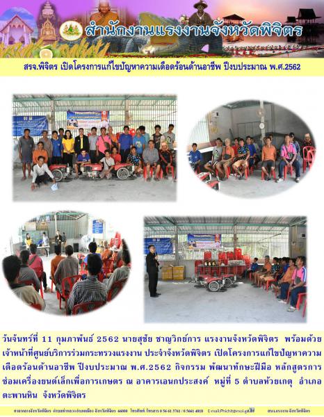 วันจันทร์ที่ 11 กุมภาพันธ์ 2562 นายสุชัย ชาญวิกย์การ แรงงานจังหวัดพิจิตร พร้อมด้วยเจ้าหน้าที่ศูนย์บริการร่วมกระทรวงแรงงาน ประจำจังหวัดพิจิตร เปิดโครงการแก้ไขปัญหาความเดือดร้อนด้านอาชีพ ปีงบประมาณ พ.ศ.2562 กิจกรรม พัฒนาทักษะฝีมือ หลักสูตรการ ซ่อมเครื่องยนต์เล็กเพื่อการเกษตร ณ อาคารเอนกประสงค์ หมู่ที่ 5 ตำบลห้วยเกตุ อำเภอตะพานหิน จังหวัดพิจิตร