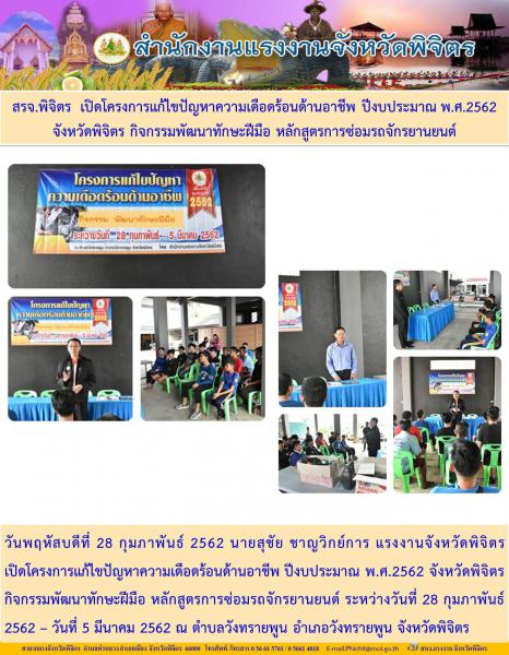 วันพฤหัสบดีที่ 28 กุมภาพันธ์ 2562 นายสุชัย ชาญวิกย์การ แรงงานจังหวัดพิจิตร เปิดโครงการแก้ไขปัญหาความเดือดร้อนด้านอาชีพ ปีงบประมาณ พ.ศ.2562 จังหวัดพิจิตร กิจกรรมพัฒนาทักษะฝีมือ หลักสูตรการซ่อมรถจักรยานยนต์ ระหว่างวันที่ 28 กุมภาพันธ์ 2562 – วันที่ 5 มีนาคม 2562 ณ ตำบลวังทรายพูน อำเภอวังทรายพูน จังหวัดพิจิตร