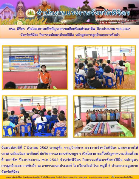 วันพฤหัสบดีที่ 7 มีนาคม 2562 นายสุชัย ชาญวิกย์การ แรงงานจังหวัดพิจิตร มอบหมายให้ นางสาวเยี่ยมวิมล พาอินทร์ นักวิชาการแรงงานชำนาญการเปิดโครงการแก้ไขปัญหาความเดือดร้อนด้านอาชีพ ปีงบประมาณ พ.ศ.2562 จังหวัดพิจิตร กิจกรรมพัฒนาทักษะฝีมือ หลักสูตรการผูกผ้าและการพับผ้า ณ อาคารเอนกประสงค์ โรงเรียนวังสำโรง หมู่ที่ 5 อำเภอบางมูลนาก จังหวัดพิจิตร