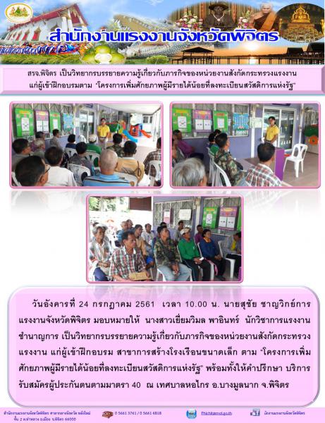 วันอังคารที่ 24 กรกฎาคม 2561 เวลา 10.00 น. นายสุชัย ชาญวิกย์การ แรงงานจังหวัดพิจิตร มอบหมายให้ นางสาวเยี่ยมวิมล พาอินทร์ นักวิชาการแรงงานชำนาญการ เป็นวิทยากรบรรยายความรู้เกี่ยวกับภารกิจของหน่วยงานสังกัดกระทรวงแรงงาน แก่ผู้เข้าฝึกอบรม สาขาการสร้างโรงเรือนขนาดเล็ก ตาม “โครงการเพิ่มศักยภาพผู้มีรายได้น้อยที่ลงทะเบียนสวัสดิการแห่งรัฐ” พร้อมทั้งให้คำปรึกษา บริการรับสมัครผู้ประกันตนตามมาตรา 40 ณ เทศบาลหอไกร อ.บางมูลนาก จ.พิจิตร