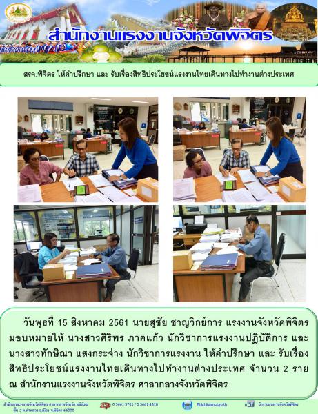 วันพุธที่ 15 สิงหาคม 2561 นายสุชัย ชาญวิกย์การ แรงงานจังหวัดพิจิตร มอบหมายให้ นางสาวศิริพร ภาคแก้ว นักวิชาการแรงงานปฏิบัติการ และนางสาวทักษิณา แสงกระจ่าง นักวิชาการแรงงาน ให้คำปรึกษา และ รับเรื่องสิทธิประโยชน์แรงงานไทยเดินทางไปทำงานต่างประเทศ จำนวน 2 ราย ณ สำนักงานแรงงานจังหวัดพิจิตร ศาลากลางจังหวัดพิจิตร