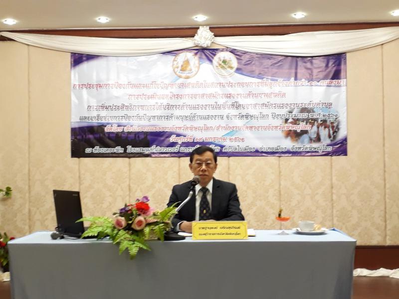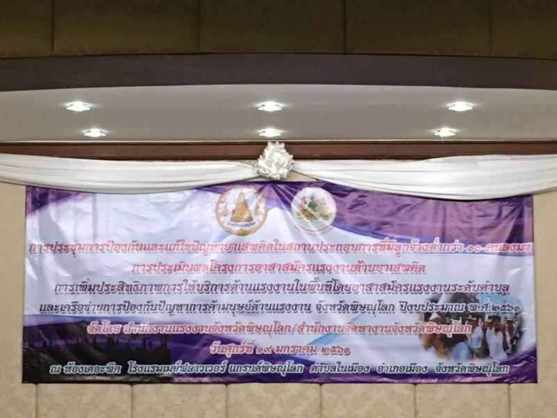 เมื่อวันศุกร์ ที่ 19 มกราคม 2561 เวลา 08.00 น. สำนักงานแรงงานจังหวัดพิษณุโลก ได้จัดการประชุมการป้องกันและแก้ไขปัญหายาเสพติดในสถานประกอบการที่มีลูกจ้างต่ำกว่า 10 คนลงมาฯ ณ ห้องเดอะพีค โรงแรมเมย์ฟลาว์เวอร์ แกรนด์พิษณุโลก ตำบลในเมือง อำเภอเมือง จังหวัดพิษณุโลก โดยมี นายฐานุพงษ์ เจริญสุรภิรมย์ รองผู้ว่าราชการจังหวัดพิษณุโลก เป็นประธานในพิธีเปิดการประชุมฯ และมีหัวหน้าส่วน ข้าราชการ เจ้าหน้าที่ในสังกัดกระทรวงแรงงาน อาสาสมัครเเรงงาน และเครือข่ายอาสาสมัรคเเรงงานจังหวัดพิษณุโลก เข้าร่วมประชุมโดยพร้อมเพรียงกัน