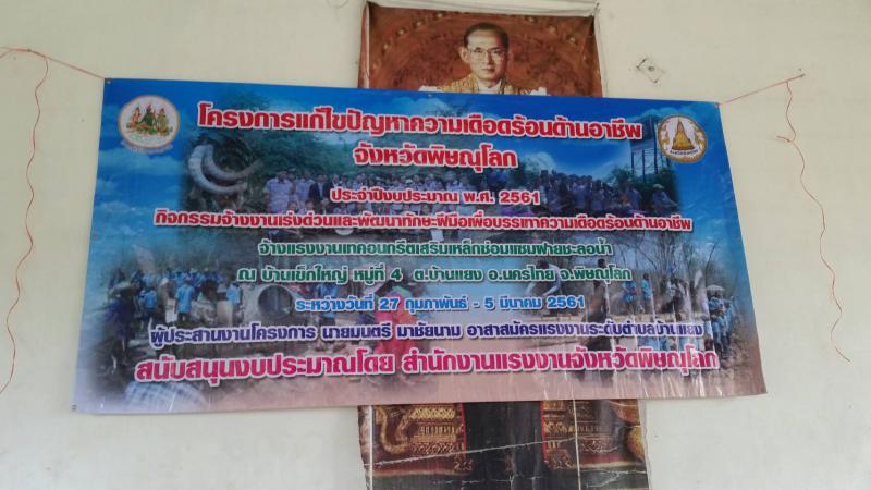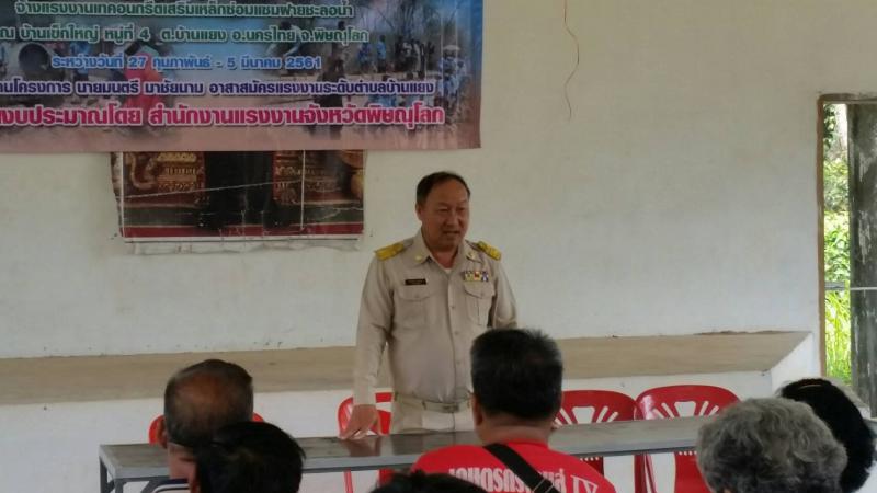 เมื่อวันอังคาร ที่ 27 กุมภาพันธ์ 2561 เวลา 14.00 น. นายเกียรติพงษ์ แสนยากุล แรงงานจังหวัดพิษณุโลก เป็นประธานเปิดโครงการแก้ไขปัญหาความเดือดร้อนด้านอาชีพ จังหวัดพิษณุโลก ประจำปีงบประมาณ 2561 กิจกรรมพัฒนาทักษะฝีมือเพื่อบรรเทาความเดือดร้อนด้านอาชีพ จ้างแรงงานเทคอนกรีตเสริมเหล็กซ่อมแซมฝายชะลอน้ำ ระหว่างวันที่ 27 กุมภาพันธ์ – 5 มีนาคม 2561 ณ บ้านเข็กใหญ่ หมู่ที่ 4 ตำบลบ้านแยง อำเภอนครไทย พิษณุโลก ประสานงานโดยนายมนตรี มาชัยนาม อาสาสมัครแรงงานระดับตำบลบ้านแยง โดยผู้ร่วมกิจกรรมจ้างงานเร่งด่วนได้แก่ประชาชนที่มีบัตรสวัสดิการแห่งรัฐ และประชาชนทั่วไป จำนวน 40 คน รวมคนพิการ 3 คน โดยชาวบ้านสบับสนุน วัสดุอุปกรณ์ ในการเทคอนกรีตเสริมเหล็กซ้อมแซมฝายชะลอน้ำ