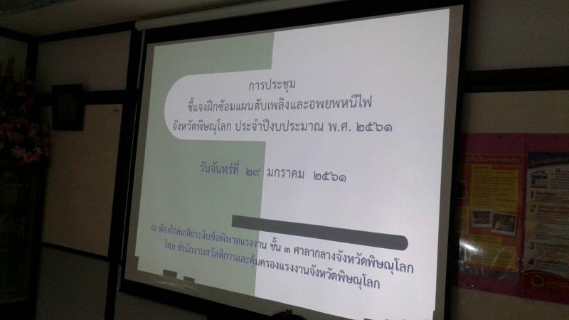 เมื่อวันจันทร์ ที่ 29 มกราคม 2561 เวลา 09.00 น.นายไพบูลย์ ณะบุตรจอม รองผู้ว่าราชการจังหวัดพิษณุโลก เป็นประธานในการประชุมชี้แจงการฝึกซ้อมแผนดับเพลิงและอพยพหนีไฟ สำนักงานสวัสดิการและคุ้มครองแรงงานจังหวัดพิษณุโลกและหน่วยงานที่เกี่ยวข้อง ณ ห้องไกล่เกลี่ยระงับข้อพิพาทแรงงาน สำนักงานสวัสดิการและคุ้มครองแรงงานจังหวัดพิษณุโลก ชั้น 3 ศาลากลางจังหวัดพิษณุโลก (อาคารหลังใหม่) โดยมีนายเกียรติพงษ์ แสนยากุล แรงงานจังหวัดพิษณุโลก พร้อมด้วยหัวหน้าส่วนราชการ ข้าราชการ และเจ้าหน้าที่ สังกัดกระทรวงแรงงาน เข้าร่วมประชุมและซักซ้อมแผนในวันและเวลาดังกล่าว