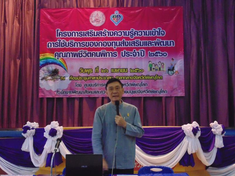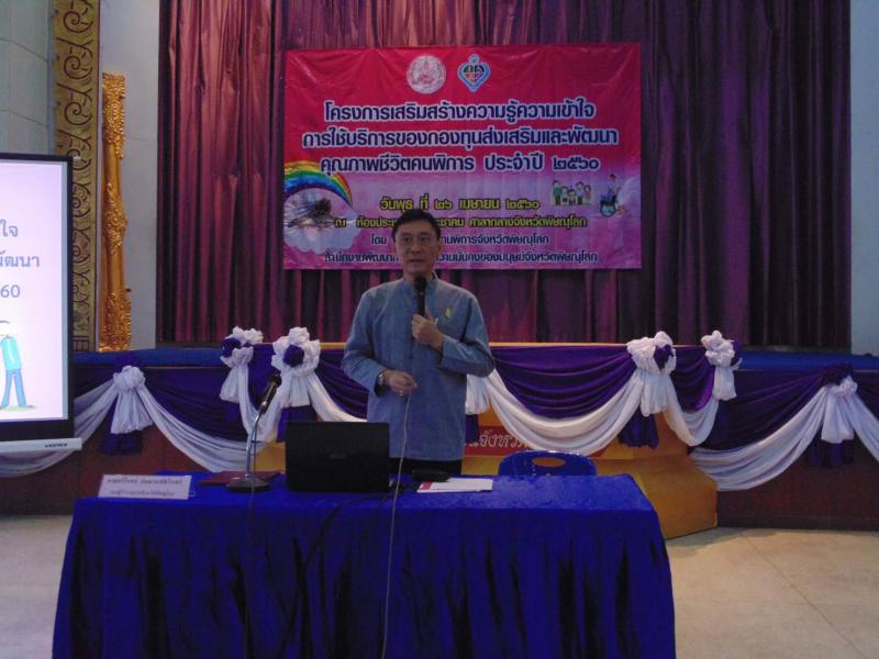 เมื่อวันพุธที่ 26 เมษายน 2560 เวลา 09.00 น. นายศรีโรจน์ นิมมานพัชรินทร์ รองผู้ว่าราชการจังหวัดพิษณุโลก เป็นประธานเปิดการประชุมโครงการเสริมสร้างความรู้การใช้บริการของกองทุนส่งเสริมและพัฒนาคุณภาพชีวิตคนพิการ ประจำปี 2560 ณ ศาลาประชาคม ศาลากลางจังหวัดพิษณุโลกโดยมีนายเกียรติพงษ์ แสนยากุล แรงงานจังหวัดพิษณุโลก เข้าร่วมเปิดการประชุมโครงการฯดังกล่าว พร้อมด้วยหัวหน้าส่วนราชการสังกัดกระทรวงแรงงานในวันและเวลาดังกล่าว