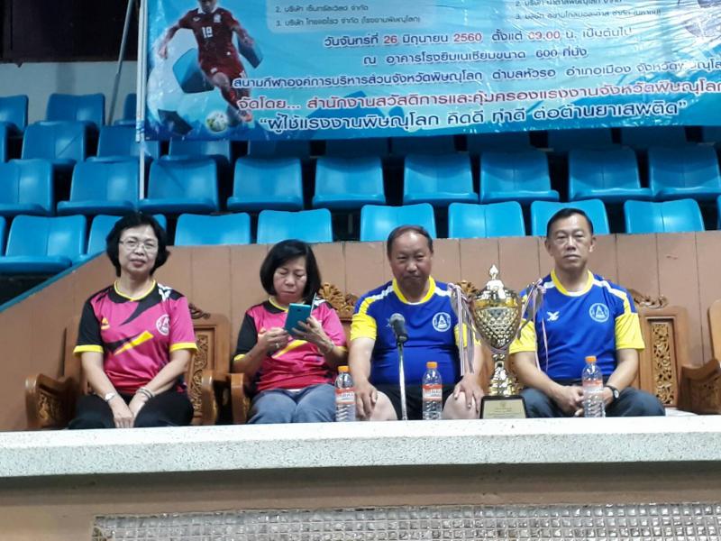 เมื่อวันจันทร์ที่ 26 มิถุนายน 2560 เวลา 14.00 น. นายฐานุพงศ์ เจริญสุรภิรมย์ รองผู้ว่าราชการจังหวัดพิษณุโลก เป็นประธานในพิธีมอบถ้วยรางวัลชนะเลิศการแข่งขันฟุตซอลต้านยาเสพติดระหว่างสถานประกอบกิจการ “เนื่องในวันต่อต้านยาเสพติดโลก” พร้อมร่วมแข่งขันกีฬาฟุตซอลคู่พิเศษ ระหว่างผู้บริหาร (ชาย) กับพนักงาน (หญิง) ณ อาคารโรงยิมเนเซียม ขนาด 600 ที่นั่ง สนามกีฬาองค์การบริหารส่วนจังหวัดพิษณุโลก ตำบลหัวรอ อำเภอเมืองจังหวัดพิษณุโลก โดยมีนายเกียรติพงษ์ แสนยากุล แรงงานจังหวัดพิษณุโลก พร้อมด้วยหัวหน้าส่วนราชการ ข้าราชการและเจ้าหน้าที่ สังกัดกัดกระทรวงแรงงาน เข้าร่วมการแข่งขันในวันและเวลาดังกล่าว
