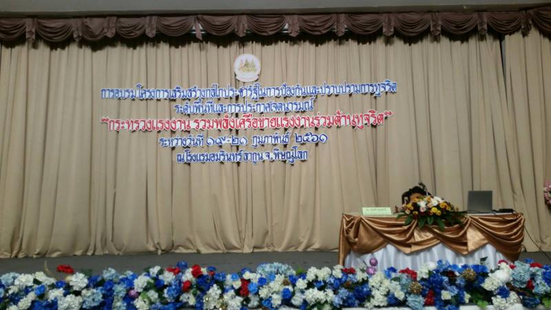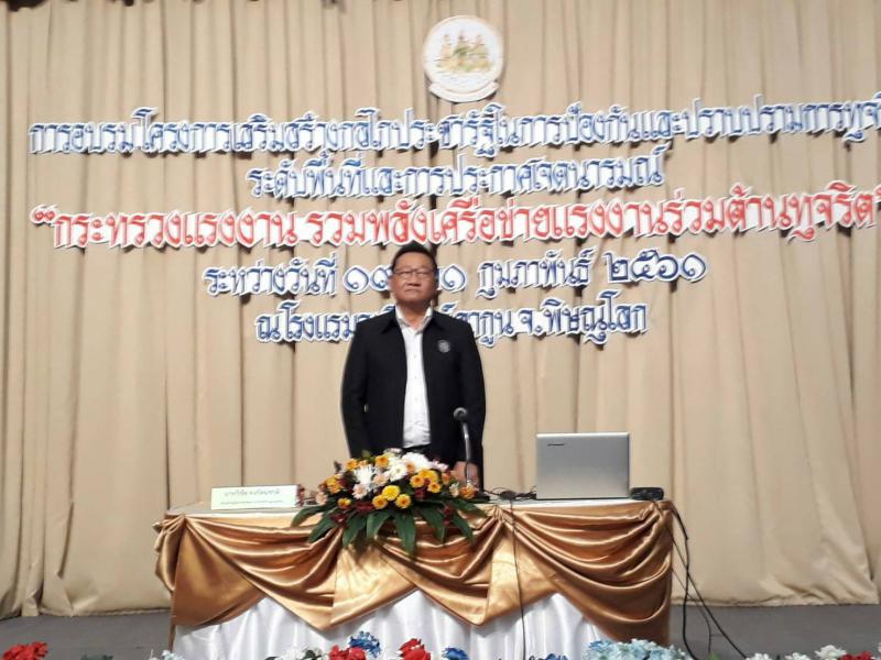 เมื่อวันที่ 19-21 กุมภาพันธ์ 2561 เวลา 10.00 น. นายวิชัย คงรัตนชาติ ผู้ตรวจราชการกระทรวงแรงงาน เป็นประธานในพิธีเปิดโครงการเสริมสร้างกลไกประชารัฐในการป้องกันและปราบปรามการทุจริตระดับพื้นที่ ณ ห้องพิษณุโลกคอนเวนชั่น โรงแรมอัมรินทร์ ลากูน จังหวัดพิษณุโลก โดยมีนายเกียรติพงษ์ แสนยากุล แรงงานจังหวัดพิษณุโลก พร้อมด้วยหัวหน้าส่วนราชการ สังกัดกระทรวงแรงงาน ข้าราชการ อาสาสมัครแรงงาน 16 จังหวัดภาคเหนือ จำนวน 350 คน เข้าร่วมพิธีเปิดและเข้าร่วมอบรม ในวันและเวลาดังกล่าว