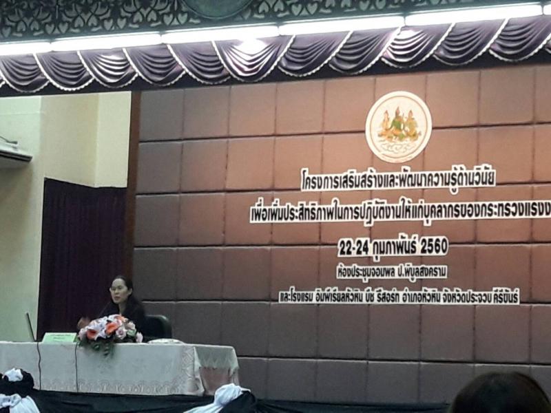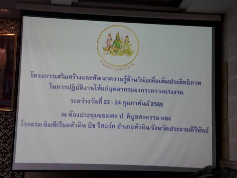 เมื่อวันที่ 22 กุมภาพันธ์ 2560 สำนักงานแรงงานจังหวัดพิษณุโลก ได้มอบหมายให้ นางอิสรา ชูแก้ว เจ้าพนักงานการเงินและบัญชีชำนาญงาน เข้าร่วมโครงการเสริมสร้างและพัฒนาความรู้ด้านวินัยเพื่อเพิ่มประสิทธิภาพในการปฎิบัติงานให้แก่บุคลากรของกระทรวงแรงงาน ระหว่างวันที่ 22-24 กุมถาพันธ์ 2560 ณ ห้องประชุมจอมพล ป.พิบูลสงคราม และ โรงแรม อิมพีเรียลหัวหิน บีช รีสอร์ท อำเภอหัวหิน จังหวัดประจวบคีรีขันธ์