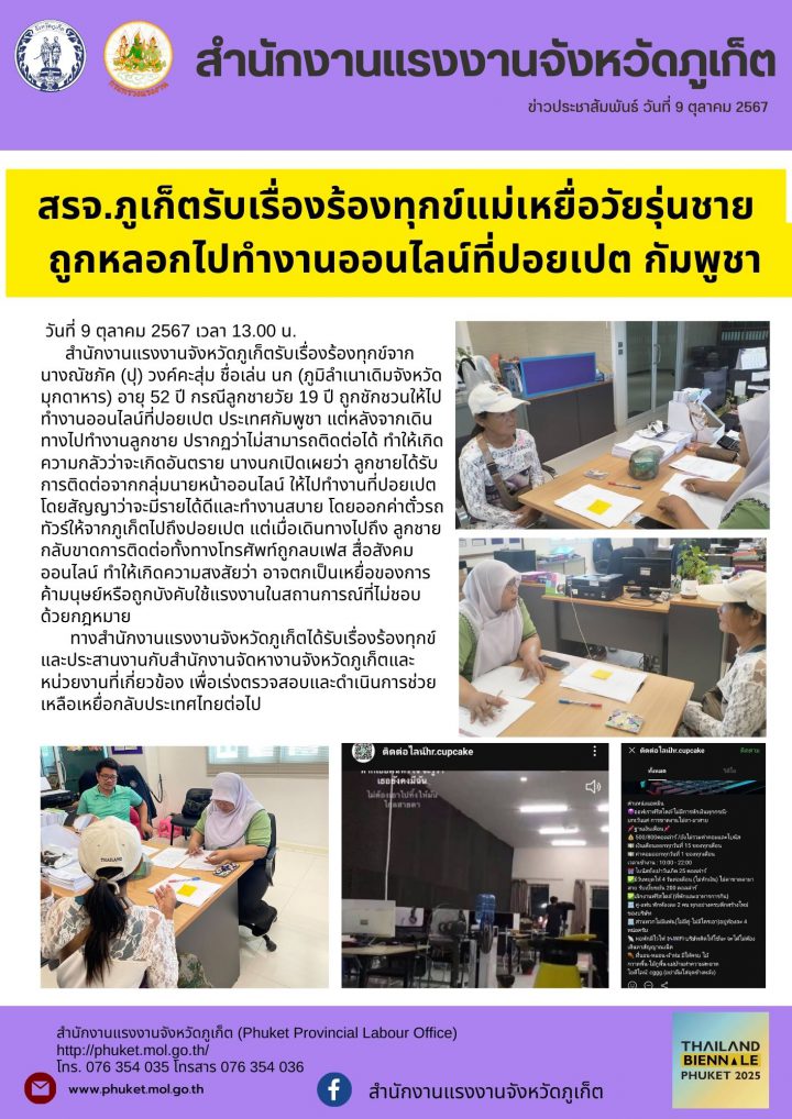 สรจ.ภูเก็ตรับเรื่องร้องทุกข์แม่เหยื่อวัยรุ่นชาย ถูกหลอกไปทำงานออนไลน์ที่ปอยเปต กัมพูชา