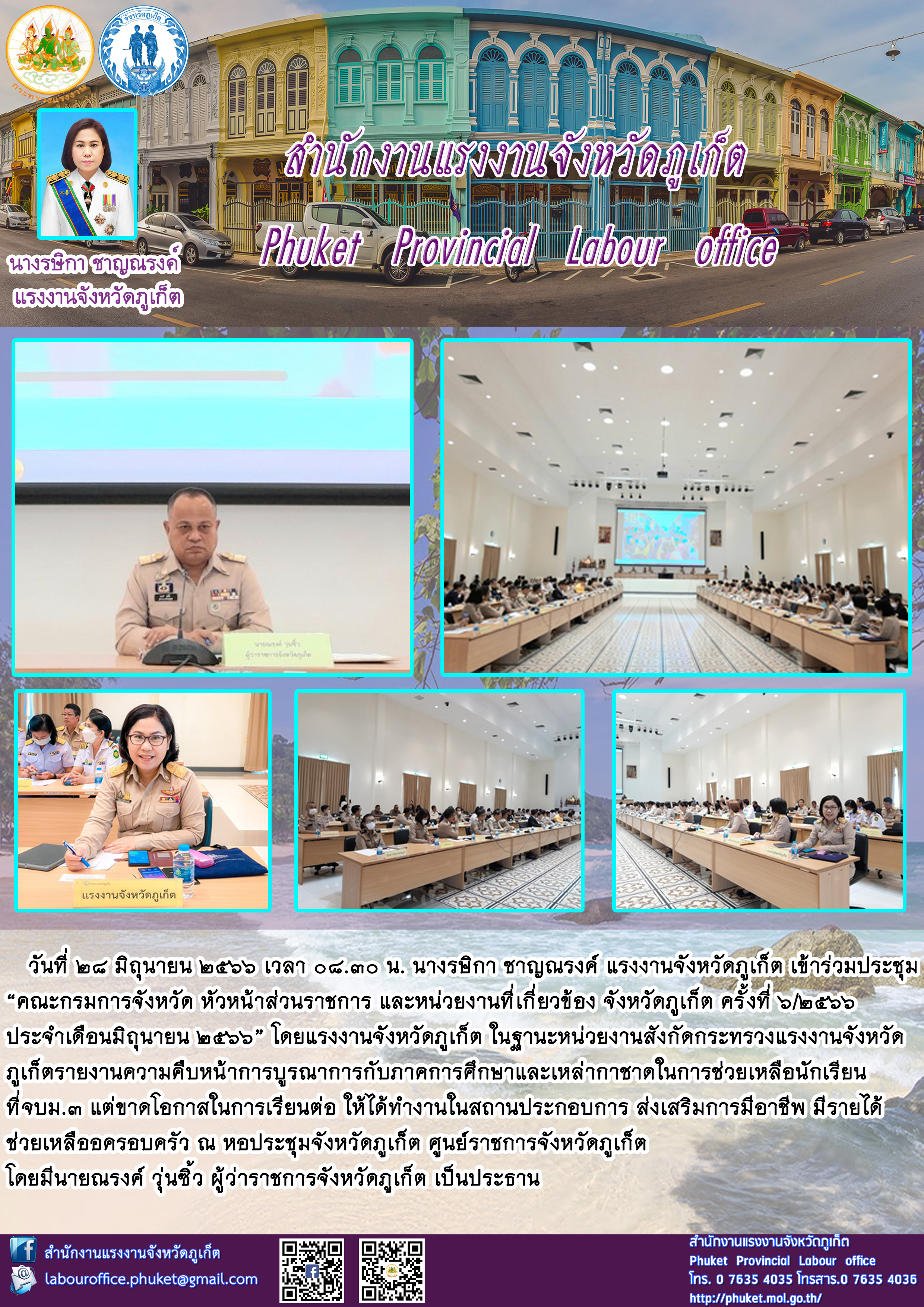 วันที่ 28 มิถุนายน 2566 เวลา 08.30 น. นางรษิกา ชาญณรงค์ แรงงานจังหวัดภูเก็ต เข้าร่วมประชุม “คณะกรมการจังหวัด หัวหน้าส่วนราชการ และหน่วยงานที่เกี่ยวข้อง จังหวัดภูเก็ต ครั้งที่ 6/2566 ประจำเดือนมิถุนายน 2566” โดยแรงงานจังหวัดภูเก็ต ในฐานะหน่วยงานสังกัดกระทรวงแรงงานจังหวัดภูเก็ตรายงานความคืบหน้าการบูรณาการกับภาคการศึกษาและเหล่ากาชาดในการช่วยเหลือนักเรียนที่จบม.3 แต่ขาดโอกาสในการเรียนต่อ ให้ได้ทำงานในสถานประกอบการ ส่งเสริมการมีอาชีพ มีรายได้ช่วยเหลืออครอบครัว ณ หอประชุมจังหวัดภูเก็ต ศูนย์ราชการจังหวัดภูเก็ตโดยมีนายณรงค์ วุ่นซิ้ว ผู้ว่าราชการจังหวัดภูเก็ต เป็นประธาน