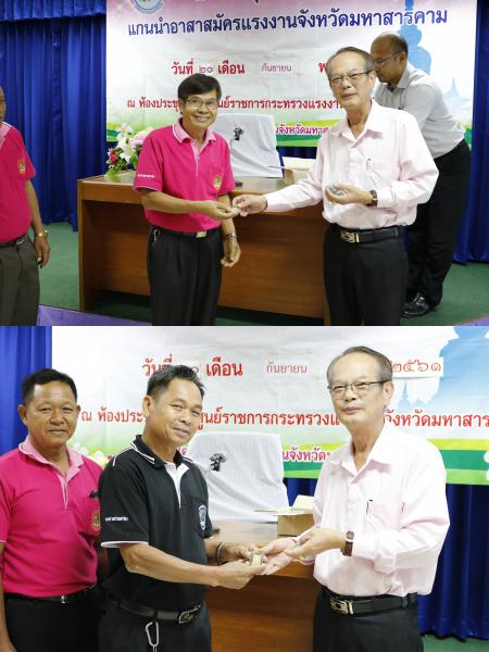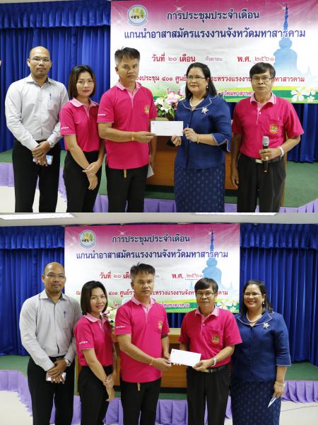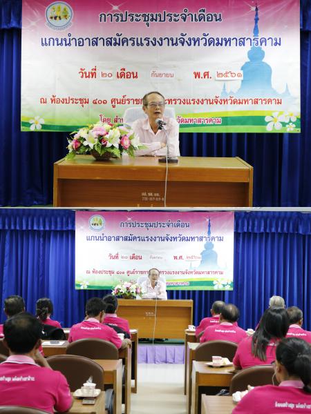 20 ก.ย. 61 ณ ห้องประชุม 401 สำนักงานแรงงานจังหวัดมหาสารคาม อาคารศูนย์ราชการกระทรวงแรงงาน ประชุมอาสาสมัครแรงงานระดับตำบล ประจำเดือนกันยายน 2561 โดยมีท่านแรงงานจังหวัดมหาสารคาม (นายคเณศ พรตระกูลพิพัฒน์) เป็นประธานการประชุมและมอบพระรุ่นมงคลดวงเศรษฐี อาจารย์สุริยันต์ โฆสปัญโญ วัดป่าวังน้ำเย็น เพื่อเป็นสิริมงคล แก่ชาวอาสาสมัครแรงงานจังหวัดมหาสารคาม ทั้งนี้ อาสาสมัครแรงงานพร้อมใจร่วมอนุโมทนาบุญงานฌาปนกิจมารดาของ คุณธนวัฒน์ นันตะนะ อาสาสมัครแรงงานตำบลดอนหว่าน อ.เมืองฯ มารดาของ คุณประครอง ชนะการี อาสาสมัครแรงงานตำบลดอนเงิน อ.เชียงยืน มารดาของคุณไพทูลย์ ขำตุ้ม อาสาสมัครแรงงานตำบลเขวาใหญ่ อ.กันทรวิชัย และภรรยาของคุณเสถียร สีป้อม อาสาสมัครแรงงานตำบลนาทอง อ.เชียงยืน