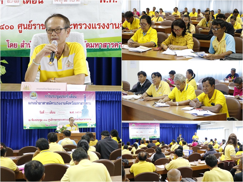 21 มิ.ย. 2562 นายคเณศ พรตระกูลพิพัฒน์ แรงงานจังหวัดมหาสารคาม เป็นประธานการประชุมอาสาสมัครแรงงานระดับตำบล ประจำเดือนมิถุนายน 2562 พี่เลี้ยงอาสาสมัครแรงงานจากหน่วยงานในสังกัดร่วมชี้แจงและติดตามผลการดำเนินงาน พร้อมมอบหมายภารกิจการดำเนินงานประจำเดือนกรกฏาคม 2562 ณ ห้องประชุม 401 สำนักงานแรงงานจังหวัดมหาสารคาม อาคารศูนย์ราชการกระทรวงแรงงาน