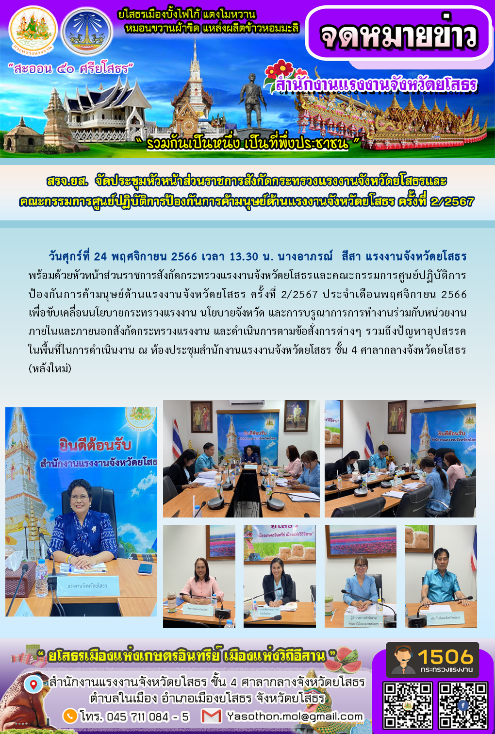 สรจ.ยโสธร จัดประชุมหัวหน้าส่วนราชการสังกัดกระทรวงแรงงานจังหวัดยโสธรและคณะกรรมการศูนย์ปฏิบัติการป้องกันการค้ามนุษย์ด้านแรงงานจังหวัดยโสธร ครั้งที่ 2/2567