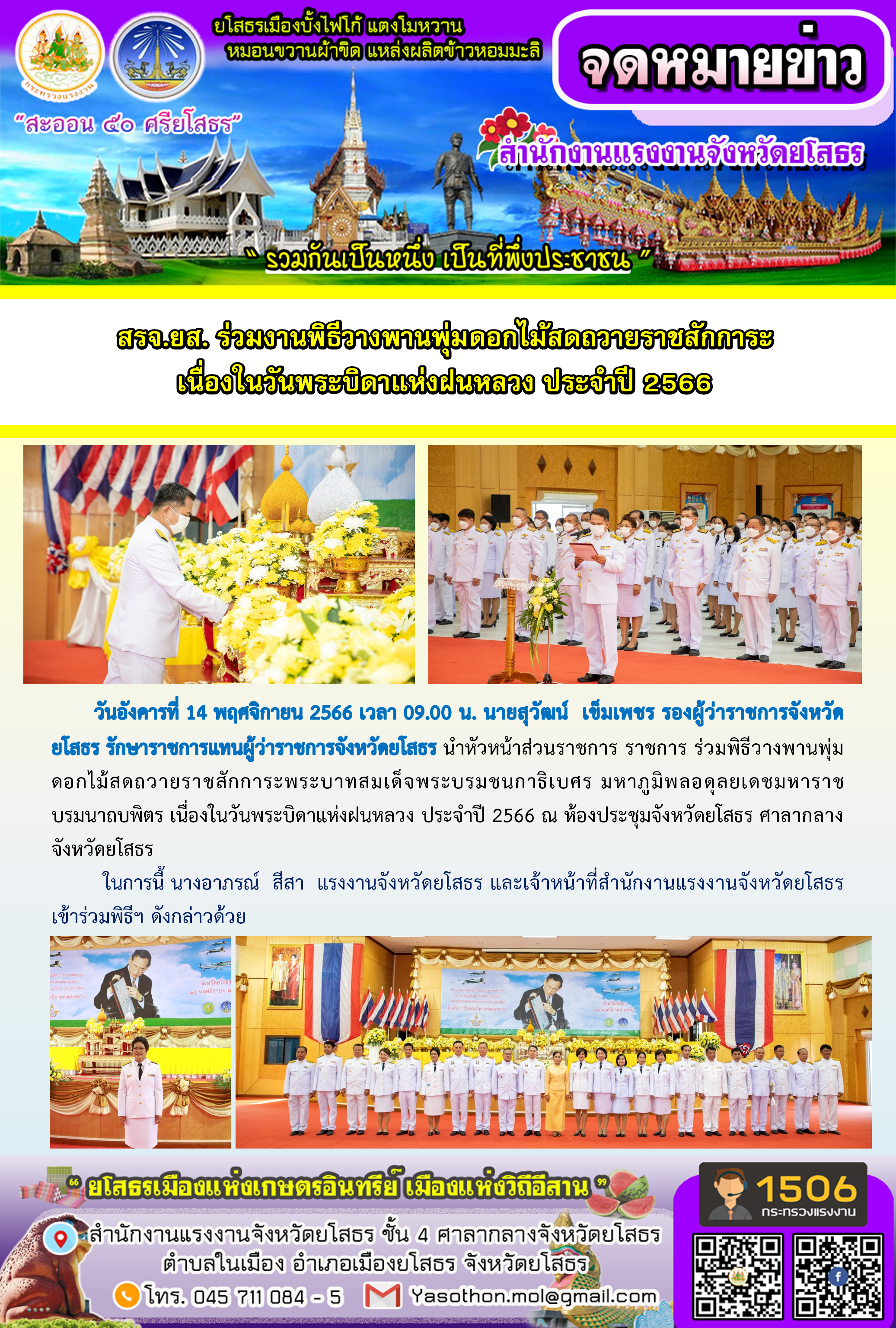 สรจ.ยโสธร ร่วมงานพิธีวางพานพุ่มดอกไม้สดถวายราชสักการะ เนื่องในวันพระบิดาแห่งฝนหลวง ประจำปี 2566