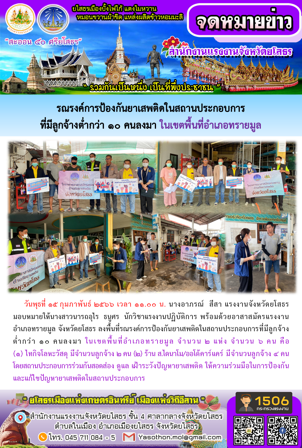 สรจ.ยส.ลงพื้นที่การบูรณาการตรวจสถานประกอบการกลุ่มเสี่ยงในสถานประกอบกิจการ จังหวัดยโสธร ครั้งที่ 2 ประจำปีงบประมาณ พ.ศ. 2566 ในเขตพื้นที่อำเภอทรายมูล